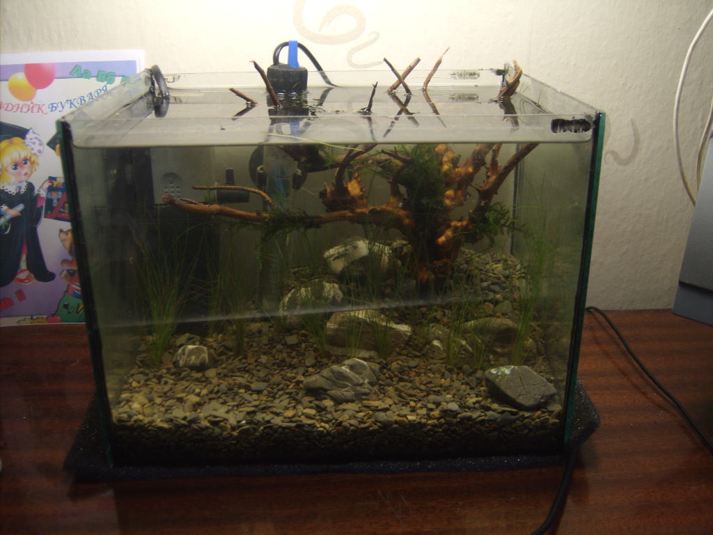 неплохая задумка! только грунт крупноватый надо бы фракцию поменьше, можно неонов штук 5или других соразмерных рыбок ,креветосов каких небуть