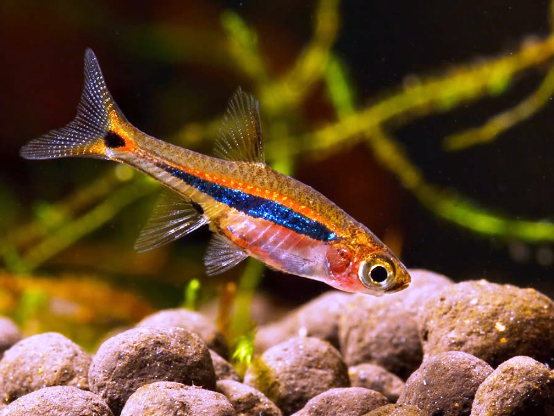 Окраска звездной расборы притягивает взгляд пестротой и контрастом. Черные и красные полосы на плавниках, красное или желтое брюшко при сине-стальных боках, щедро усыпанных яркими звездами…