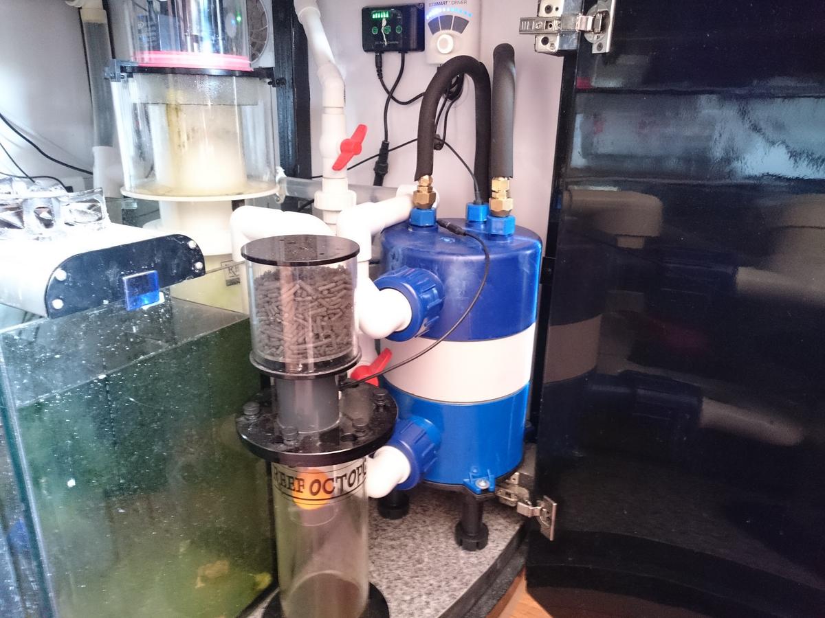 Возле холодильника? это "говносборник" в него стекает скиммат , внутри есть поплавковый геркон и когда он наполняется контроллер отключает пенник (особенно хорошо, если взбесился), а уголь сверху ,чтоб не воняло