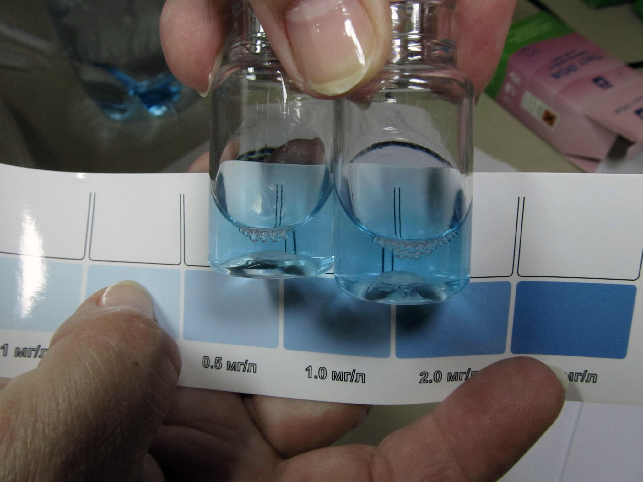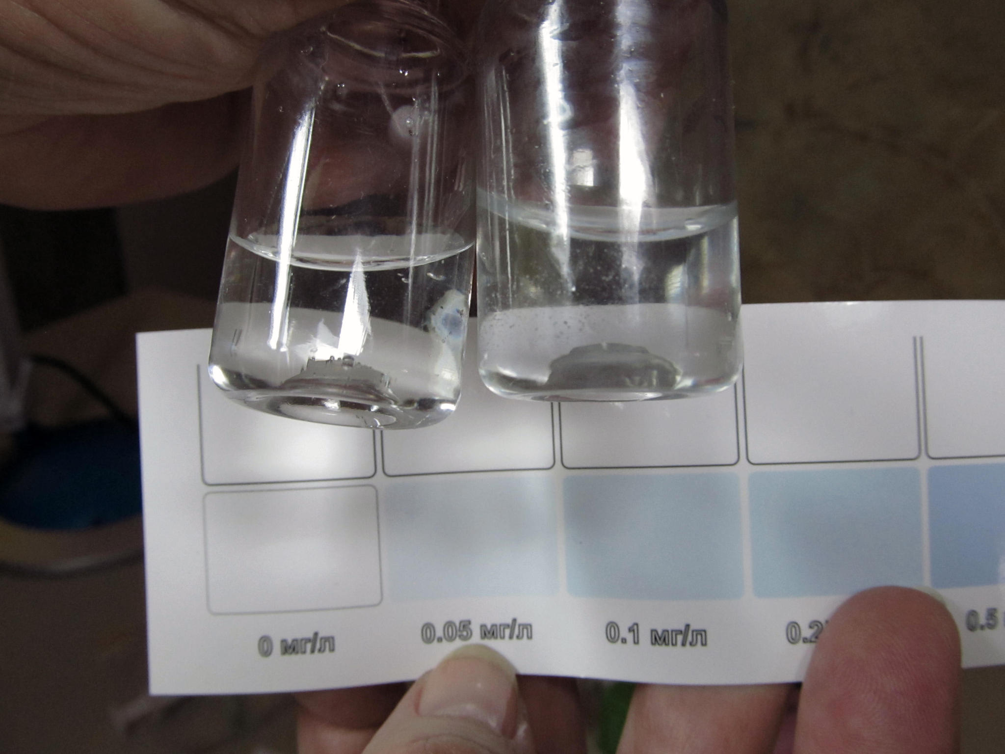 Ход работы: каждый исследуемый тест проверялся на двух образцах - испытуемом и контрольном. В испытуемом использовалась посуда из комплекта теста, в контрольном - новая, присланная производителем.За основу принималось усредненное значение. В протоколе это отражено в трех колонках по трем реперным точкам - 0 мг/л, 1 мг/л, 5 мг/л. Калибровочные растворы предоставлены производителем теста. Посуда перед испытанием промывалась обессоленной водой.