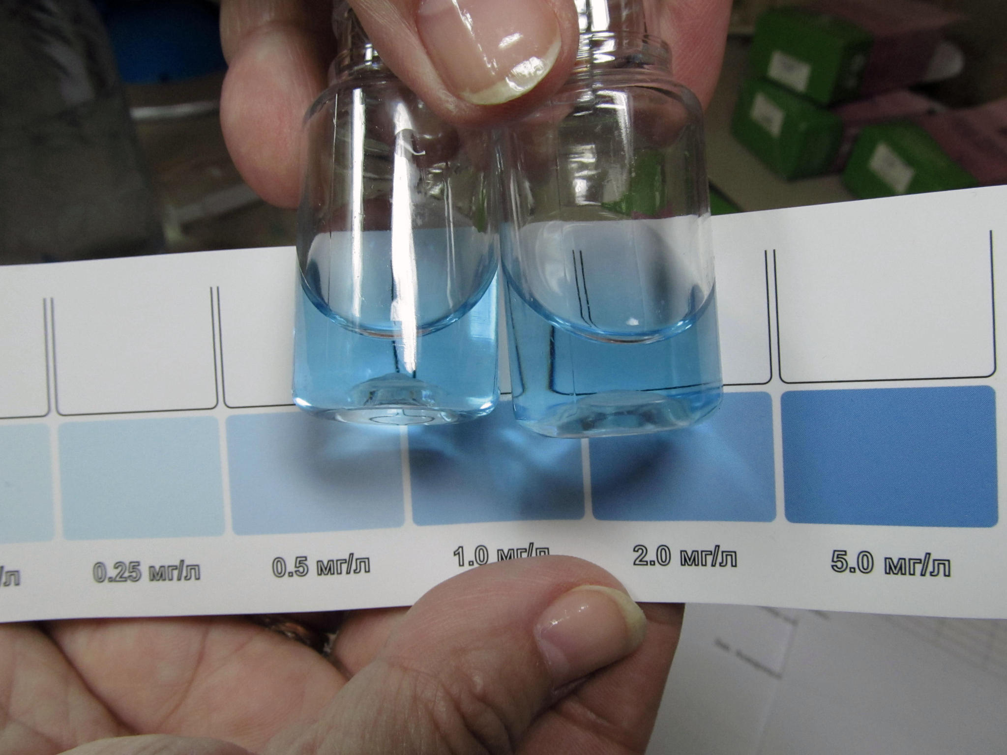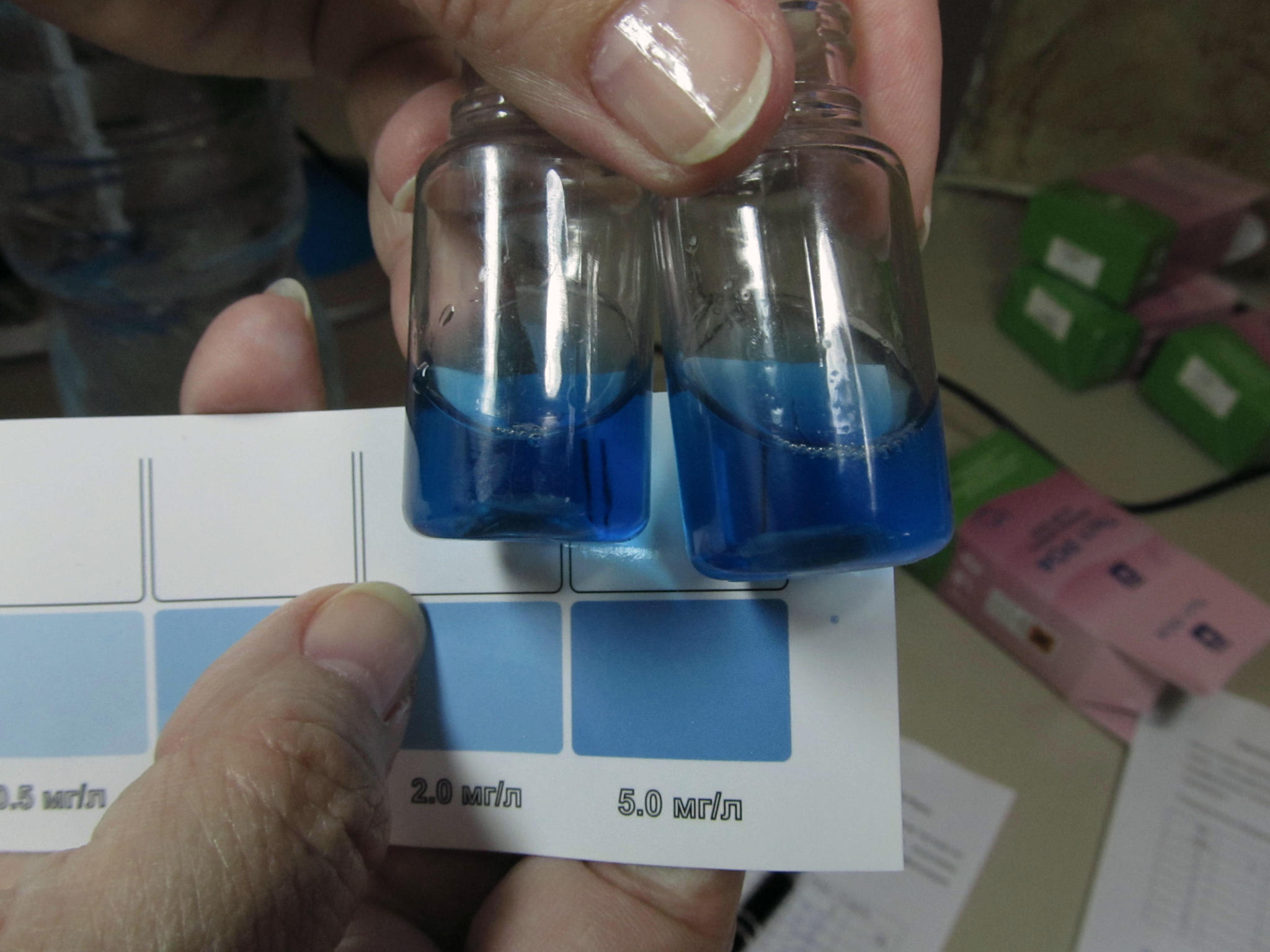 3. Серия исследований по концентрации 5 мг/л дала стабильные показания по насыщенности цвета пробы, но отличающиеся от цветовой шкалы оттенком, что позволяет сделать вывод скорее о некачественной полиграфии напечатанной на бумаге шкалы, чем о точности теста.