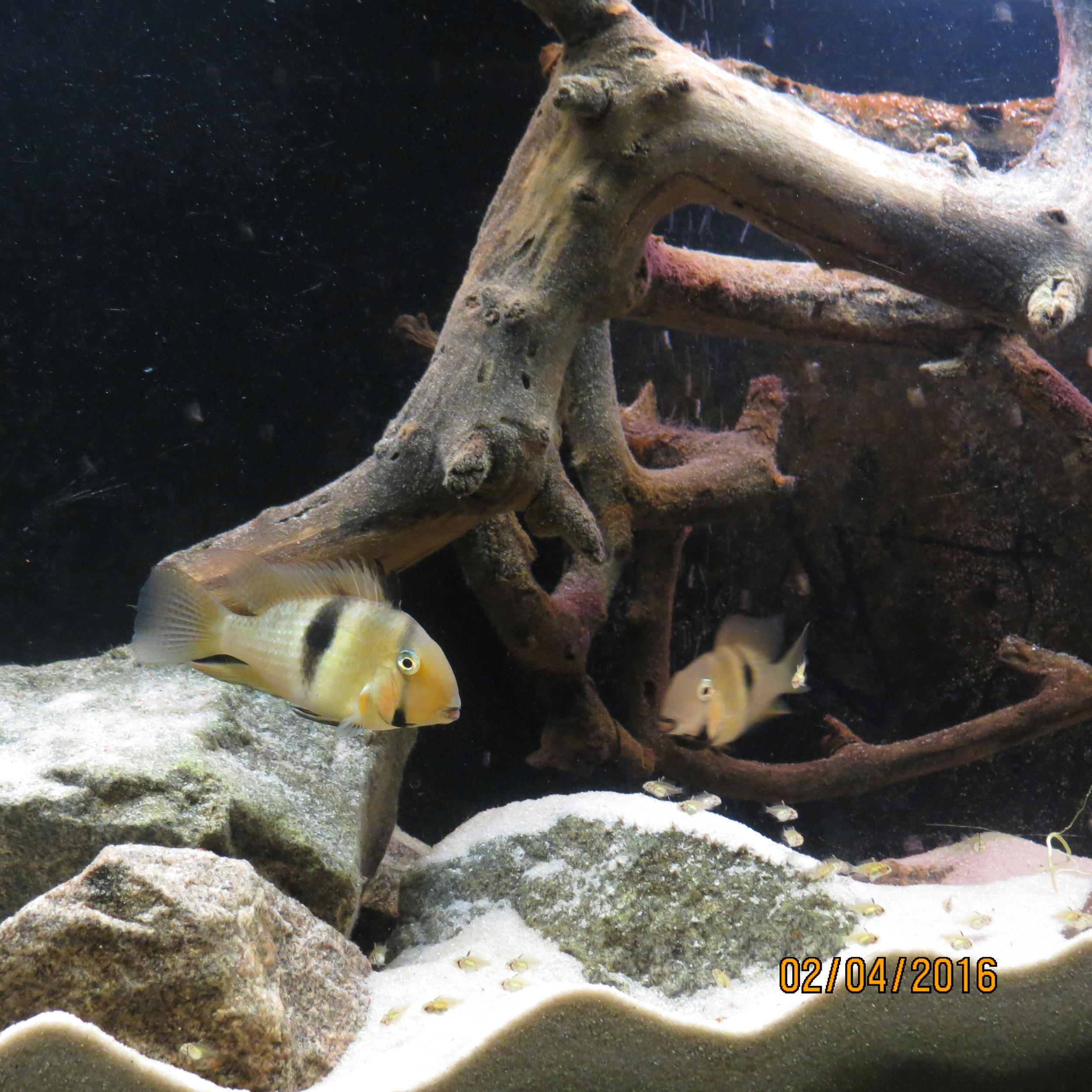 Собственного разведения, выращены на Киевской воде.Размеры 3+см. ЭКЗОТИКА и редкость в Украине. .Одна из самых эффектных и интересных цихлид.Губы как накрашенные чёрной помадой.Это относительно не большие (максимальный размер 11см.,самки меньше) , неприхотливые в содержании рыбы, обладающие красивым, утонченным окрасом тела,что немаловажно, в отличии от многих цихлид...Рыба стайная, лучше держать от 5 -6 штук, во время нереста делится на пары.Агрессия внутривидовая, еле выраженная, у меня живут с неонами и родостомусами.