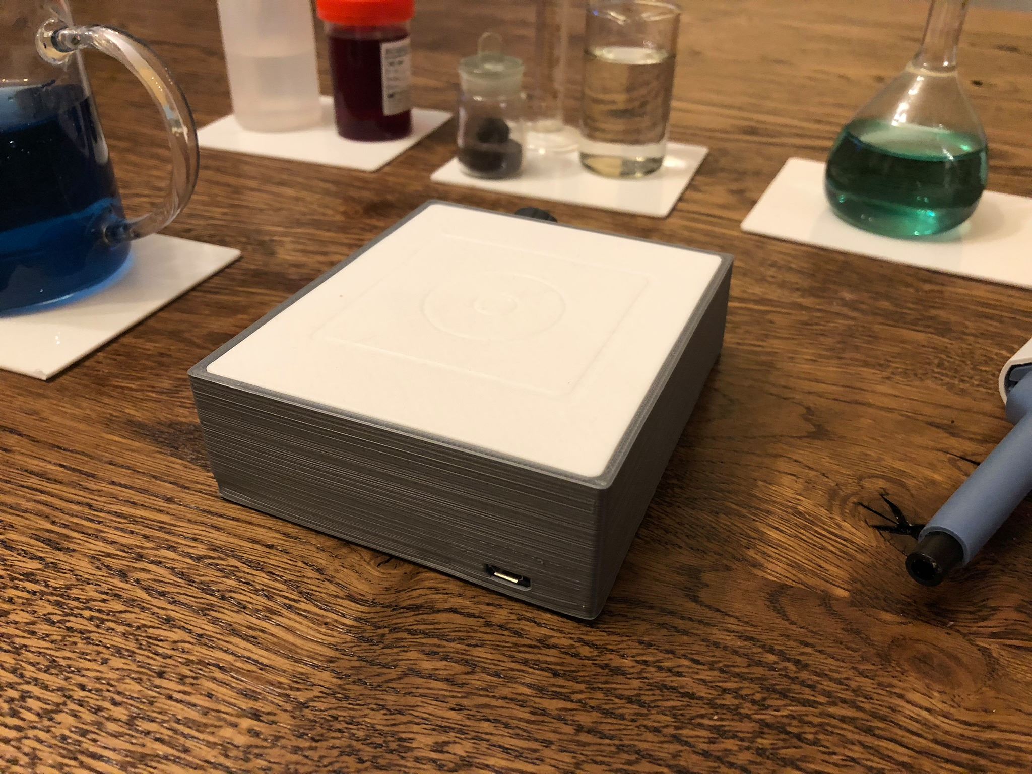 Корпус и детали напечатаны на 3D принтере - это позволило избежать большого тиража литых корпусов, что на начальном этапе неизбежно подняло бы стоимость прибора. Сейчас цена комплекта - аккумуляторная магнитная мешалка и перемешивающий якорь в тефлоновом корпусе - 800 гривен.