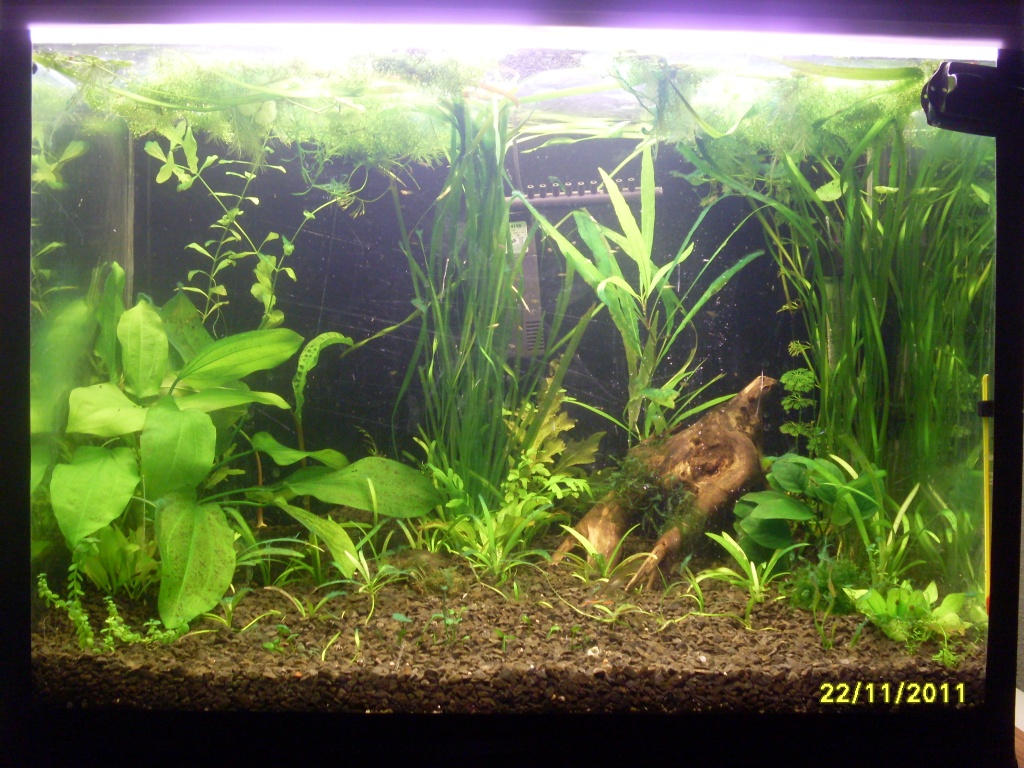 Растения: эхинодорус горизонтальный пару кустиков, валлиснерия обычная, сагитария, эхинодорус травянистый и четырехребристый, ситняг, погостемон, линдерния, прозерпинака , дидиплис, роталла индийская, криптокорина Вендта Браун, перистолистник красностебельный, хемиантус микрантемоидес на корягу примотал анубиас, пару видов мха(яванец и фиссиденс) и рикардию, пистия