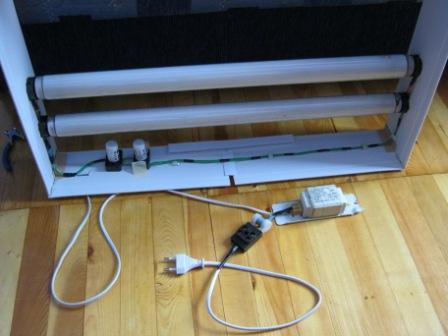 Аквариум 121 л, если не хватит добавлю таким же образом еще 2 лампы и дроссель 40 вт. При уборке просто буду вытаскивать 2 передние лампы