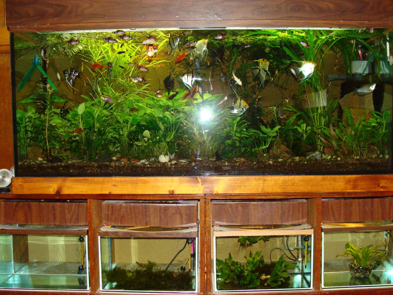 Представляю вашій увазі свою скромну господарку. Створювалася на протязі 10 років. На фото присутні-450 літрів, під ним 4 нерестовика на 25л., дискусятник на 350л., 250л. з астронатусами, 200л.-барбусятник, під ним-виростник на 100л., ще один виростник на 150л., і 50 л. під ним, а також виростник на 120л. Всі кришки, а також стійки під акваріуми виготовлялися власноруч.