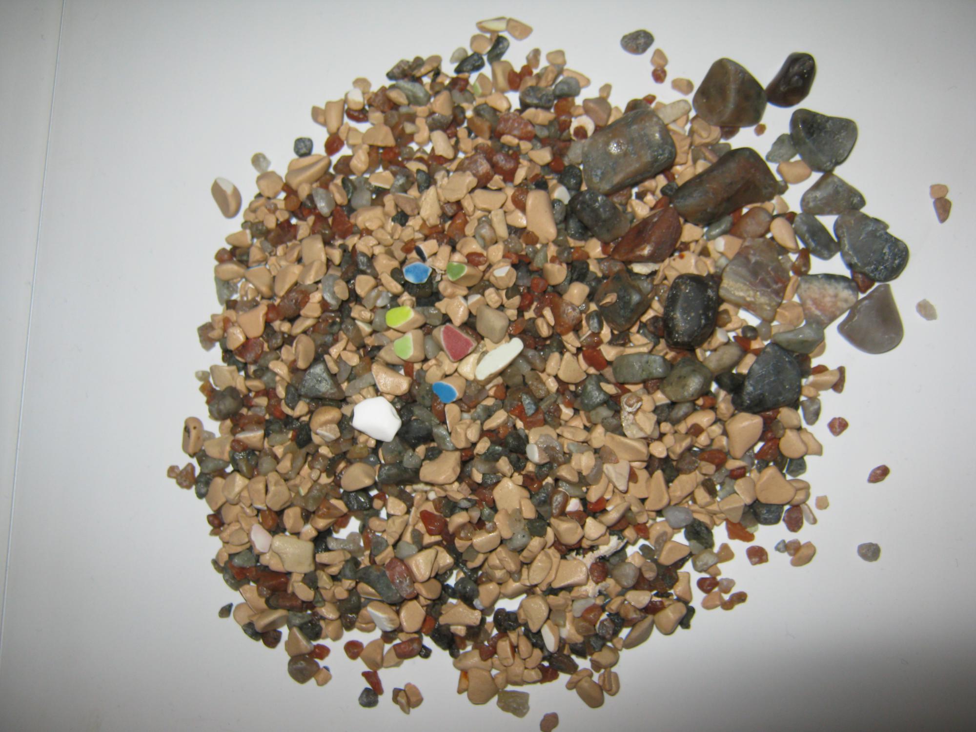 С виду похоже на кирамические отходы, кусочки бежевые похожи на глину есть с белым,синим,салатовым и т.д. И есть природные породы. Все камни гладкие.