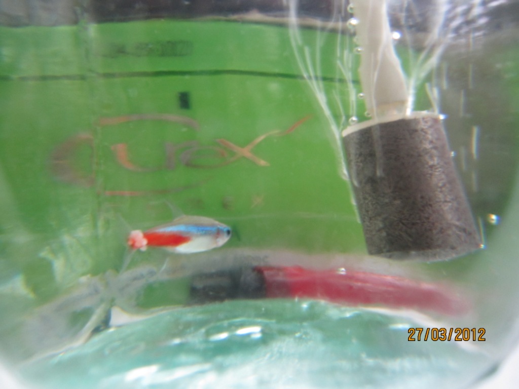 Отсадил его в 3-х литровую банку с аэрацией и подогревом, добавил Антипара 3 капли. Температура - 28гр. Сутки сидит уже - улучшений пока не заметно.