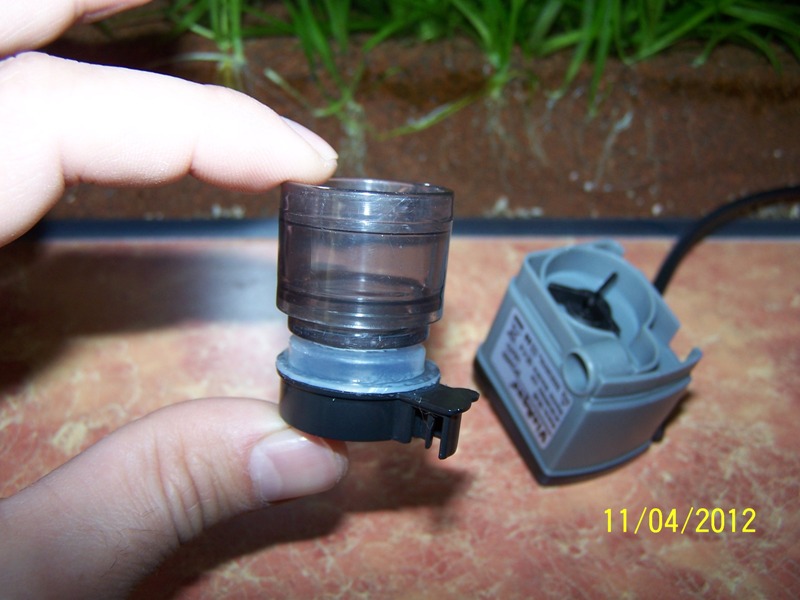 В бщем виде процесс представлен на фото. Для крепления колбы водозаборника из полиэтиленовой пробки (запчасть №4) была вырезана переходная муфта и приклеена на крышку турбинной камеры помпы. Также понадобилось срезать верхнюю часть крышки помпы, что не повлияло на целостность помпы и позволило задействовать имеющиеся на ней присоски для крепежа конструкции на стекло. Мерный колпачек от удобрений также был слегка модернизирован под нужды конструктива: срезано дно под диаметр трубки (чуть меньше 2,5 см для плотности надевания) и вырезаны 3 отверстия для забора пленки с поверхности воды. Да, ОБЯЗАТЕЛЬНО наличие сетки в верхней части заборной трубки для предотвращения попадания неразумной любопытной живности (вроде той, что на фото), под лопасти турбины помпы. Регулировка силы всасывания воды с поверхности осуществляется с помощью краника на тройнике и глубины погружения всей конструкции (в рабочем режиме верхняя часть колпачка выше поверхности на 3-5 мм) . Готовый девайс после регулировки работает совершенно бесшумно и весьма эффективно. Приятного вам рукоделия!