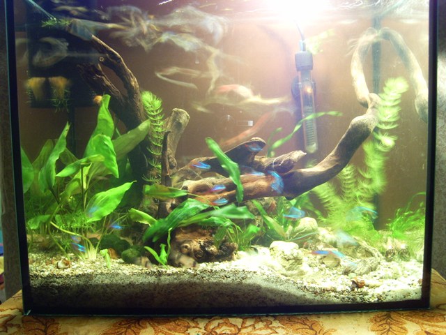 В первом моём аквариуме обитают около 15 неонов, столько же разношерстых гуппи, - гибридов нескольких известных Вам пород, созданий прелестных, несказанной красоты; две пары данио; три вуалевых анциструса, один обыкновенный; пара коридорусов-панд; три пецилии; множество креветок red cherry; три габонских фильтратора; три тиломелании black rabbit; пятёрка ампулярий – ну и множество мальков гупёшек и пецилий.