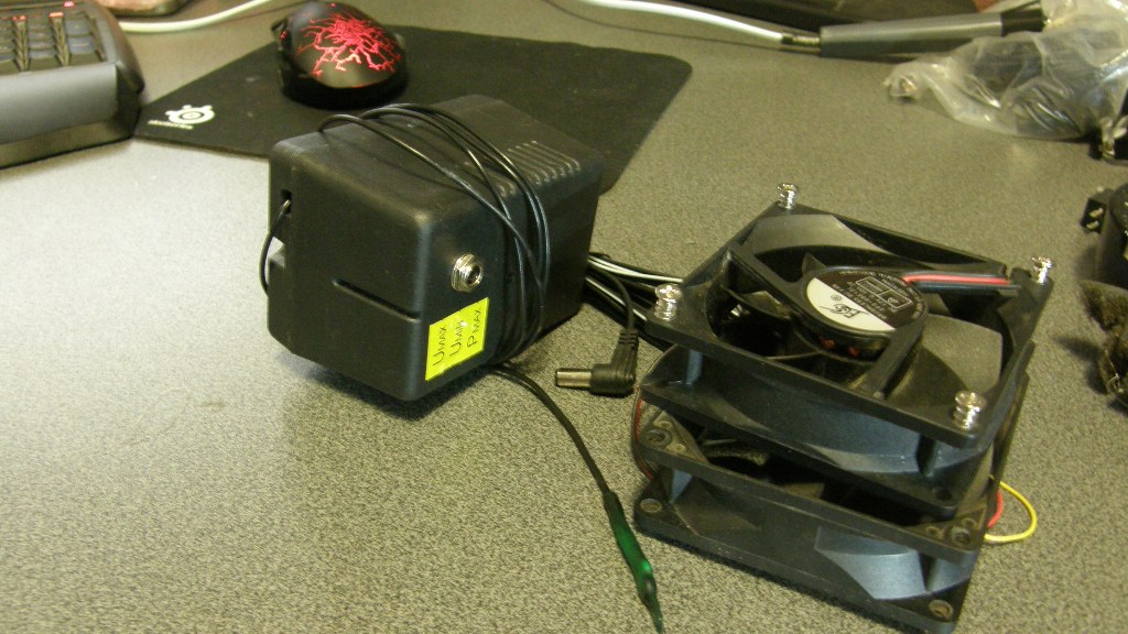 -Два вентилятора на 12в (габариты 80х80),подсоединены параллельно (шнуром примерно до 3м с штекером).