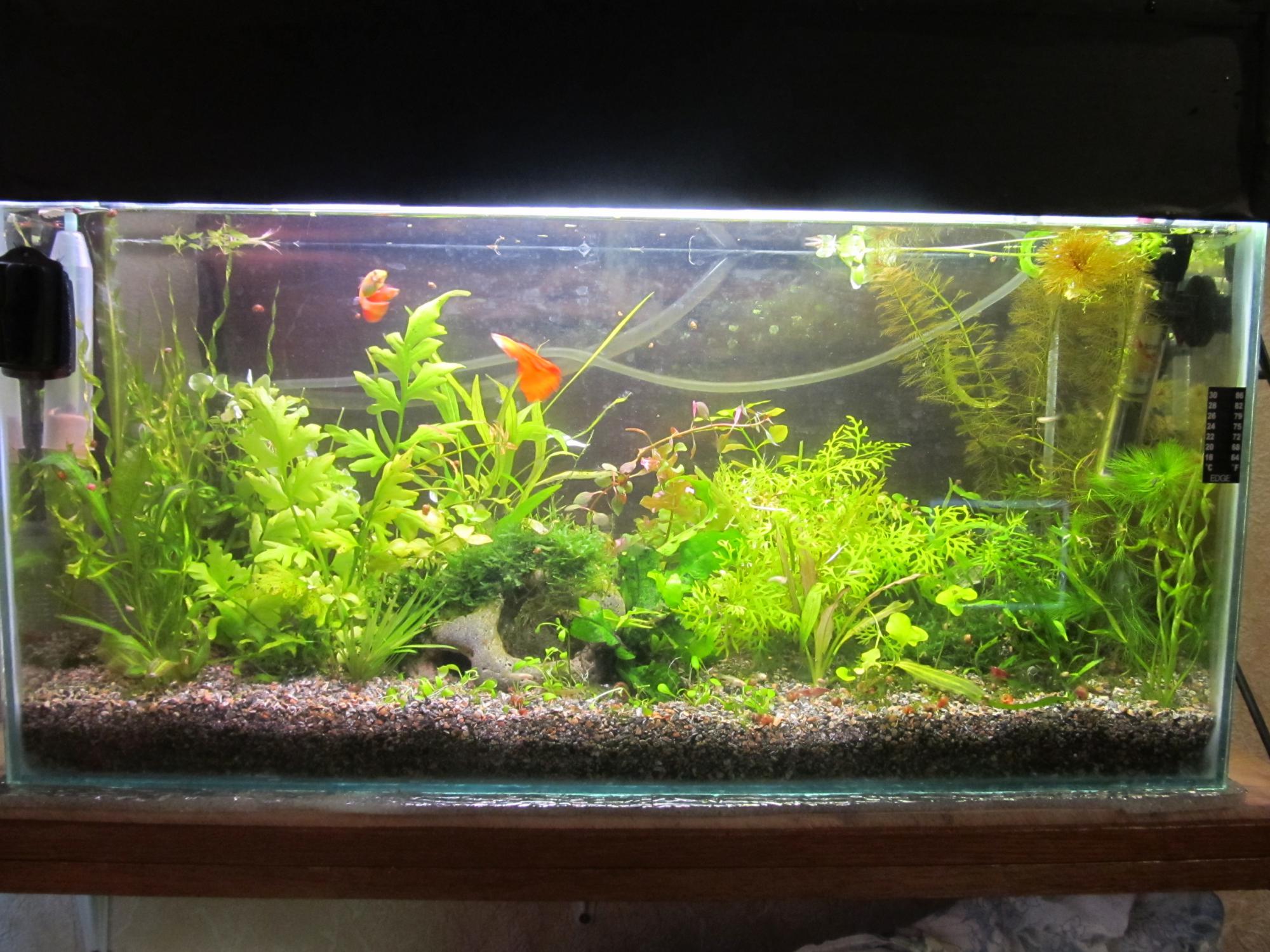 Занимался аквариумами 20 лет назад, и сейчас решил вернуться к этому хобби. Склеили с знакомым акву на 28 литров, слепили крышку, купили грунт и оборудование. Отдельное спасибо Хмельницким аквариумистам за щедрость и предоставленные растения и рыбок!