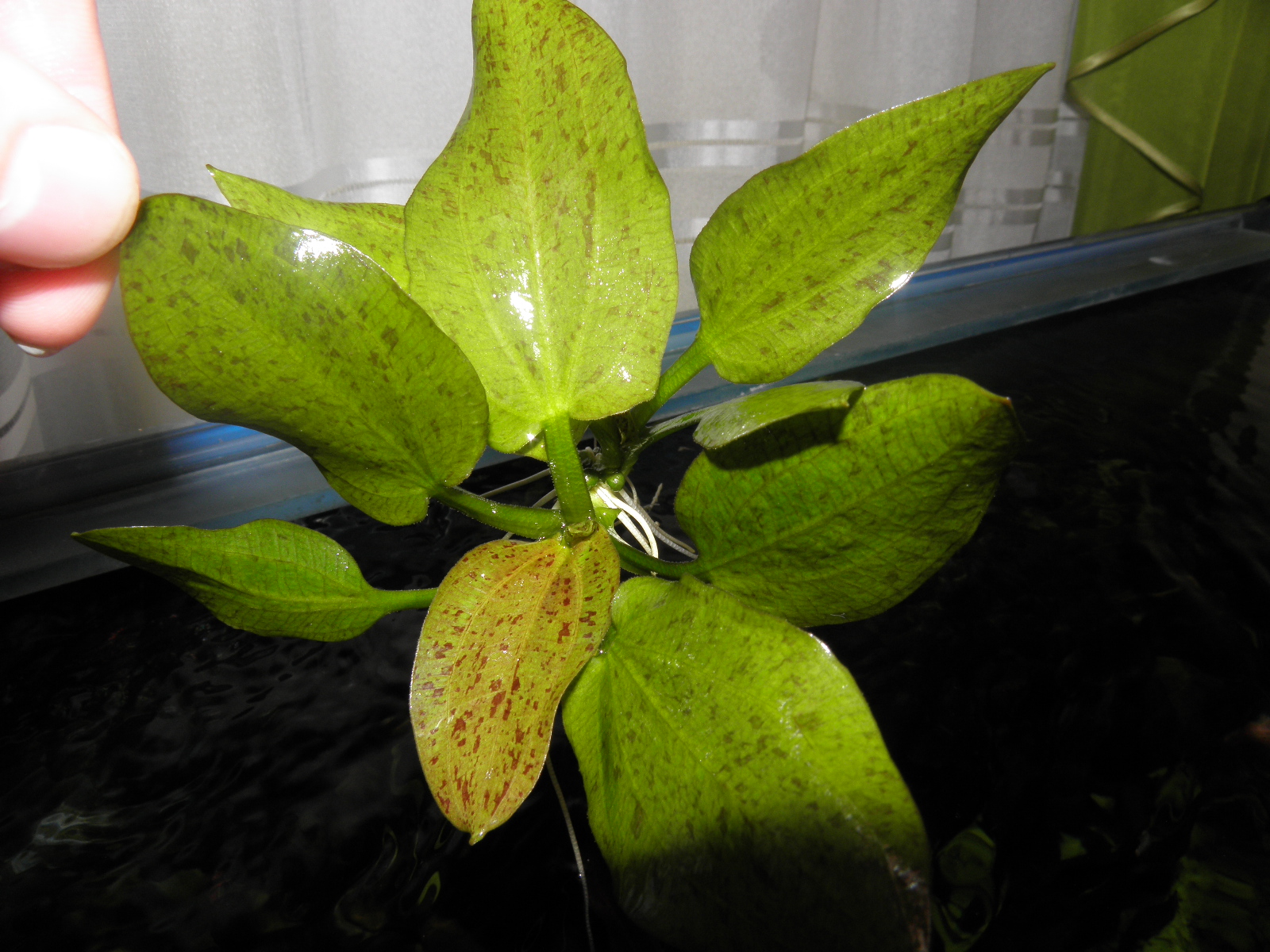 3.Эхинодорус Шлютера(раньше думал что это тоже крапчатый, но сравнил с настоящим крапчатым и почитав литературу понял что это эхинодорус Шлютера, от которого пошел леопард Шлютера. Этот эхинодорус на средний план и имеет более выраженый и красивый крап чем у крапчатого и основание листа более сердцевидное). Детка двойная(видно на фото) так что вы получите фактически две детки этого красивого растения.