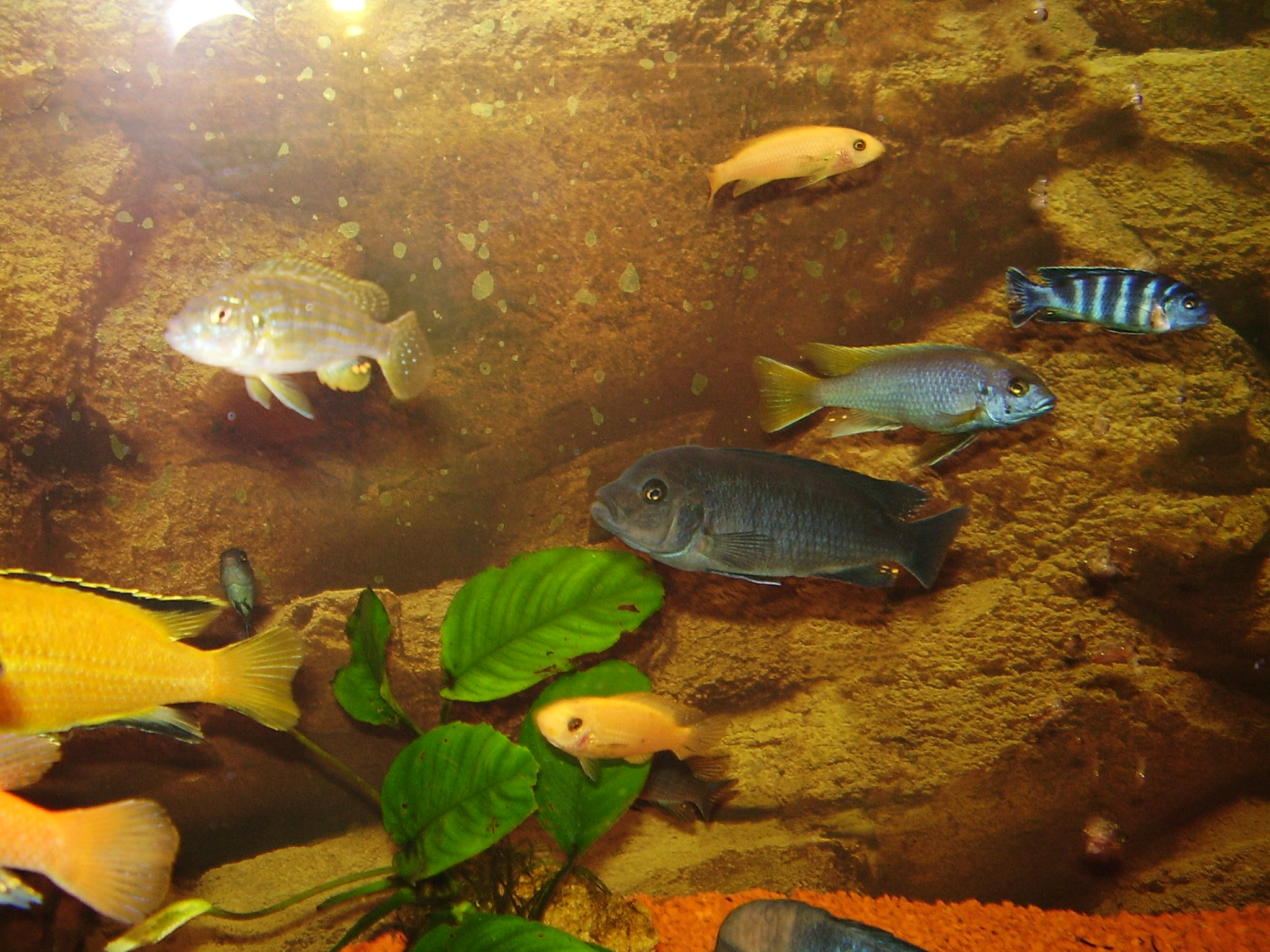 с желтым хвостом Pseudotropheus acei, а с ниже какой то из видов зебры.