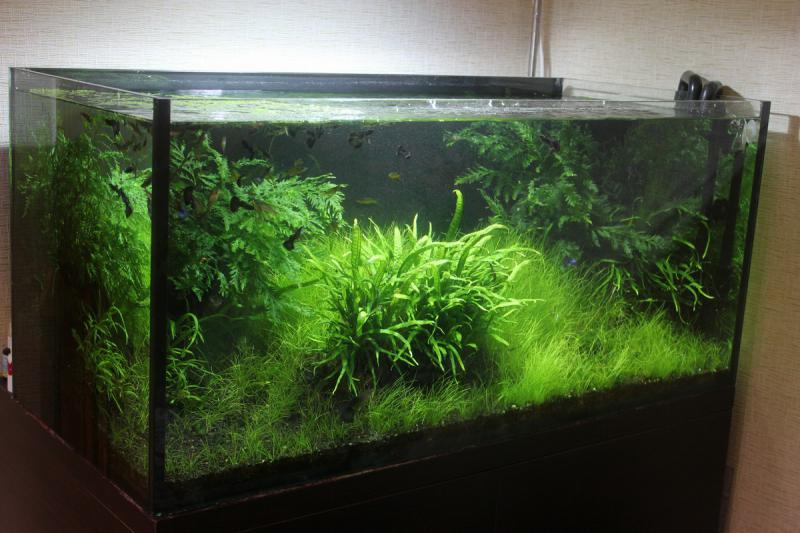 Аквариум был задуман как требующий на себя минимум внимания. И скажу так, у меня получилось! Аквариум был запущен в июне и за это время стриг один раз папоротники. И возможно скоро постригу элеохарис… очень медленный и удобный аквариум.. и так кратко: