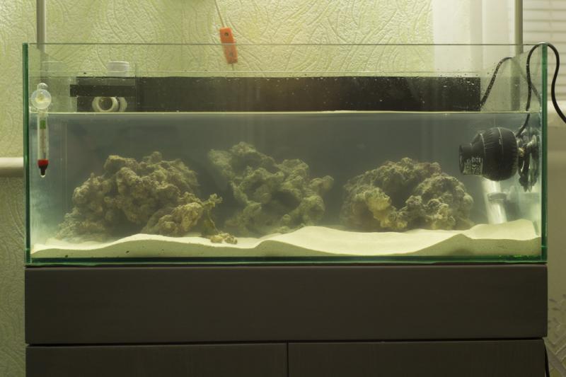 4 кг песка засыпано и аккуратно "по тарелочке" залито 17 воды из действующей банки и 10 литров свежей, предварительно с вечера засоленной воды