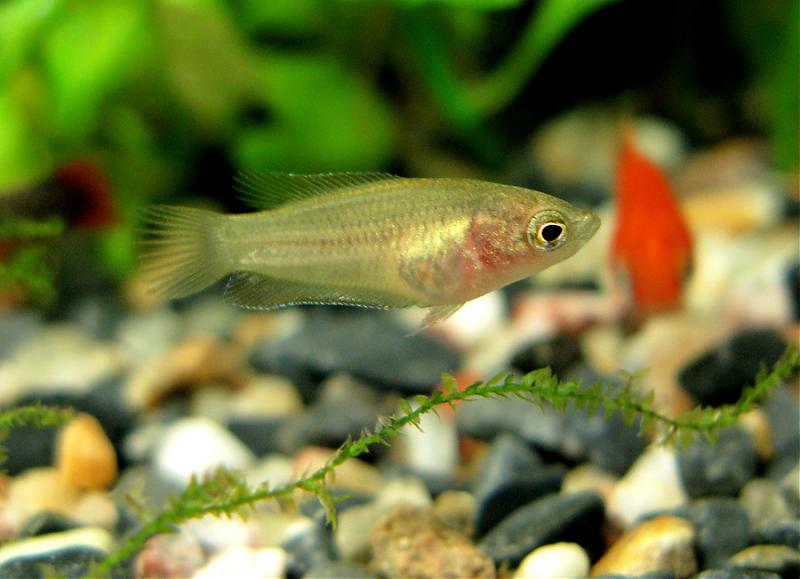 Вот еще фотка малыша, который был случайно обнаружен в макроподнике. Теперь живет в другом аквариуме, растет, правда, не очень быстро, но уже похож на макропода! Надеюсь, вырастет богатрыем.