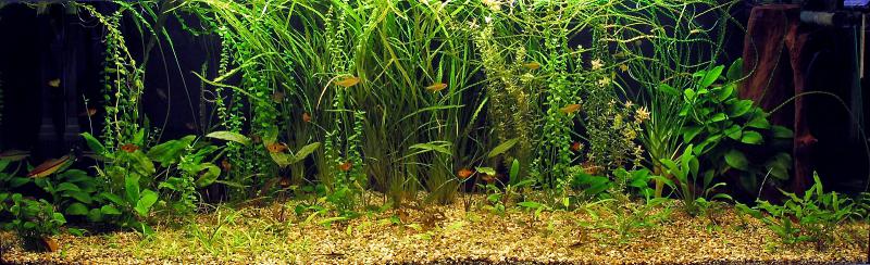 Аквариум запущен и функционирует как о-очень медленный травник, преимущественно населённый криптокоринами, анубиасами и кринумами. Немного карликовой саггитарии, тенеллус и ротала с бакопой.