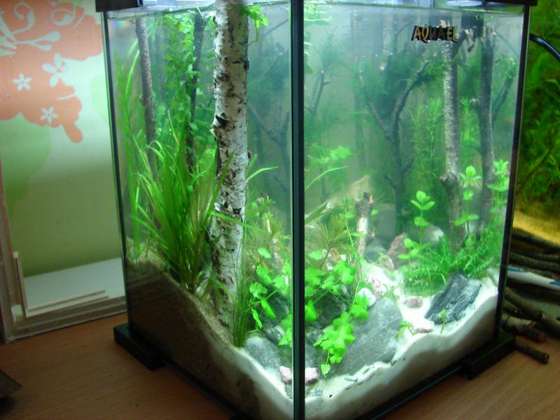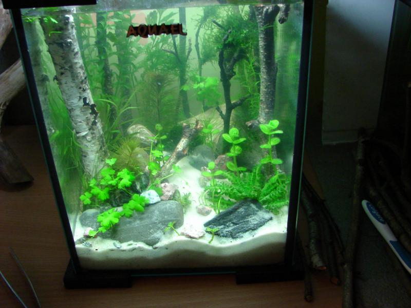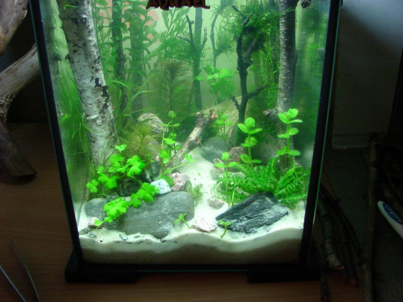 Пока как видите глобальных изменений в лучшую сторону-- нет.....Запустил креветок чериков.... Наверно нужно немного времени...тем более грунт обычный не заряженный кварц.....травник не форсированный, СО пока тоже не подаю....Но вот появились зато первые проблемки.....Обработка древесины кипятком результатов не дало и появились типа пузырей(че это я не знаю...мне игорь без коры давал корягу так на ней тоже такое появилось и я ее тупо вынул из аквы, а че тут делать пока не знаю--может подскажите че???? ....кстати вода прозрачная(более менее) а вот на фотках получается типа нериальный мутняк(может из за света?) или фоткать не умею....Теперь вот думаю не погорячился ли я в сетками с корой......может придется в срочном порядке варить новые..... но видел же люди делали именно с корой и с разных пород деревьев...может знают--то че я не знаю....Опять забыл добавить---Изночально хотел сделать аквариум с наименьшим вмешательством(опыт есть на 30 литрах)т.е. только только долив , если и подмена то раз в 1-1,5 месяца без УДО(только при подмене) и без СО2.Правда свет там были экономки 2шт. холодная и теплая, а с этой лампой пока неработал.