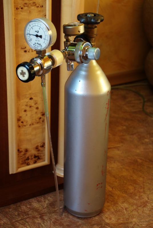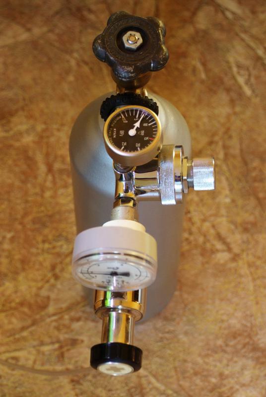 На выход навинчен медицинский кислородный редуктор (поршневого типа, кажись так они называются, где в корпусе расположены рычаги напоминающими качелю). На редукторе установлен манометр давления в баллоне и клапан сброса давления.