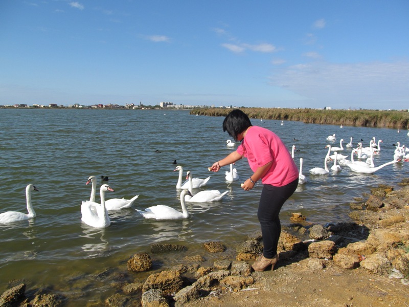 Переночевав в Евпатории, утром выехали в сторону Севастополя с намерением посетить Балаклаву, которую давно собирались посмотреть, но все как-то не получалось. Выехав за город, у берега озера увидели большое количество лебедей, совершенно не боящихся людей и охотно берущих угощения из их рук.