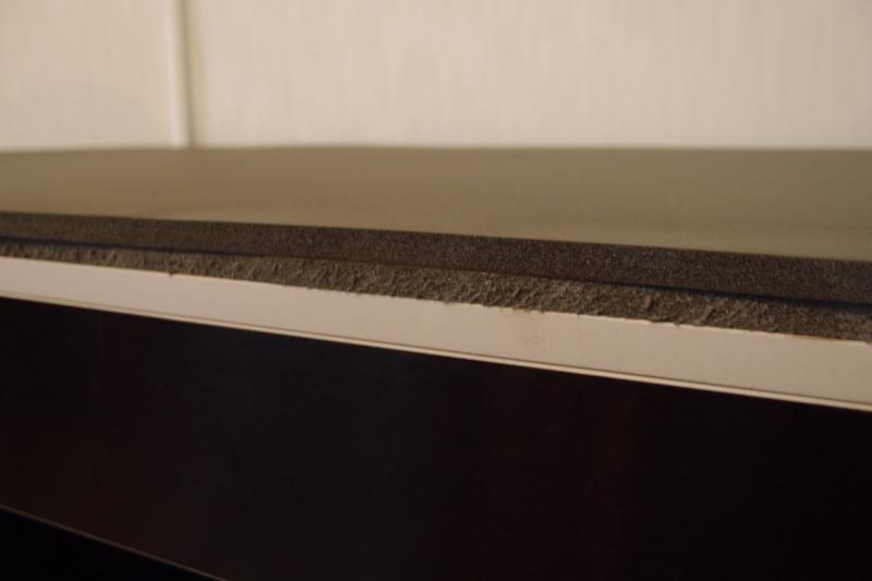 Но на смену одним страхам пришли другие. Тумба нуждалась в капитальной переделке. Вода, которая периодически стекала по стеклам от разборок шалуна паку (50см, 3,2кг) с араваной, дала о себе знать. ДСП разбухло везде, где было только можно, столешница дала прогиб в середине больше 10мм (как выдержало дно банки ума не приложу), так что стекло посередине висело над пенопластом с зазором больше 1мм, т.е. свободно. Боковые стенки по торцам разбухли. Нижняя часть тумбы просела под нагрузкой и дверки нормально не закрывались. если бы не мет. каркас, все бы давно было бы очень плохо.