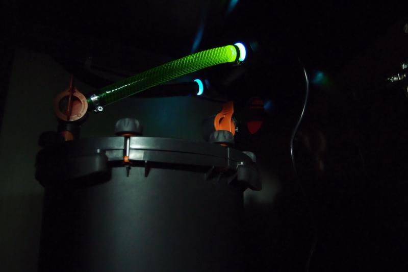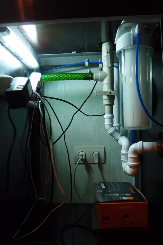 Купил УФ-стериализатор. Смотрел, читал, все сравнивал, но купил Джебо на 18 Вт. Лампу включал, характерный запах учуял, успокоился и подключил. Начитавшись ужасов про рассыпающиеся от УФ-излучения штуцеры, выточил сразу из нержавейки замену, но пока не поставил (так красиво смотрятся их светящиеся полоски ))) лежат наготове, думаю что за пару месяцев ничего не случится. Придумаю альтернативу флюваловскому шлангу на 25мм, чтоб такой же мягкий и гибкий, поменяю вместе с ним. На вход подачи воды из водопровода поставил колбу с полипропиленом 10 мкм. Вода у нас хорошая, хоть и жесткая, посмотрю как себя поведет фильтр. Выход завел во флейту выпуска фильтра.
