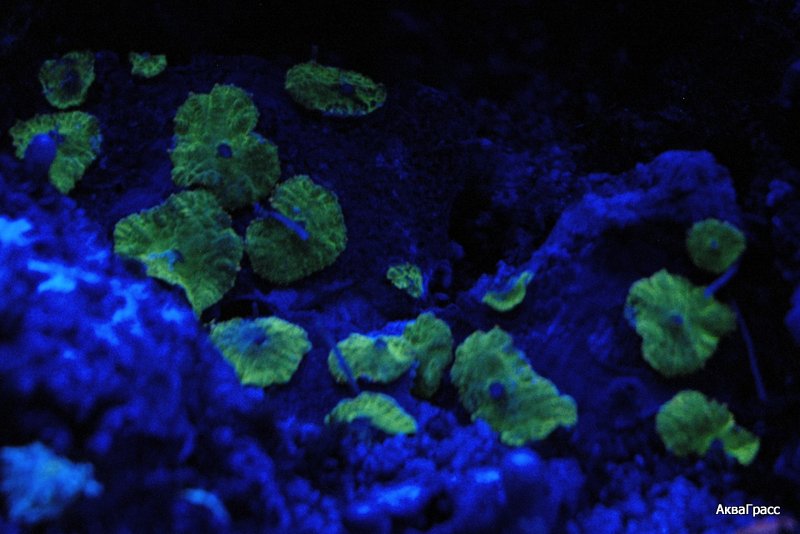 Есть вот такие зонтики как на фото ниже. Оливковые с голубыми серединками и желтыми ртами. Размер полипов до 8 мм. Под синими диодами они очаровательны!