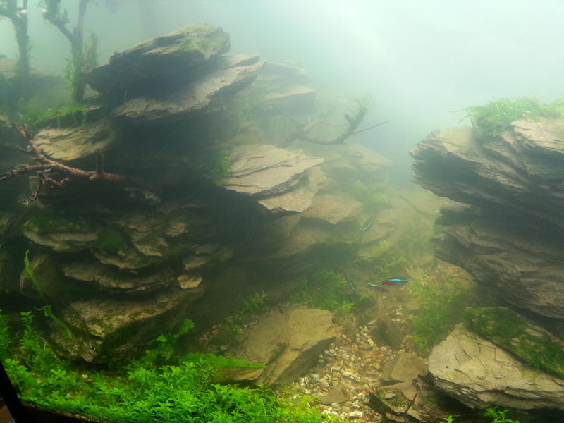 Товарищ Акробат, хочу заметить, что с водопадом посередине и двумя ущельями по бокам композиция стала чересчур симметричной, ИМХО. Я даже вначале подумал, что на фото видно отражение в каком-то зеркале. Думаю вам стоит на свежую голову когда вода прояснится еще раз внимательно посмотреть на текущее состояние. Может быть захотите что-то подкорректировать. ИМХО. Камни классные, но с их фактурой я бы делал только одно ущелье. Может как в той работе на IAPLC с ущельем. Просто взгляд со стороны, вам безусловно виднее, может просто на текущих фото я не разглядел чего-то.