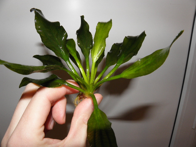 Цитата: "Его листья растут не вертикально, а немного согнутыми вниз. При росте растения в аквариуме образуется розетка, имеющая ширину до 30 см, количество листьев в среднем 10—20, они достигают высоты 5—15 см. По этой причине Эхинодорус портуалегренский хорошо подходит для озеленения только переднего плана. "