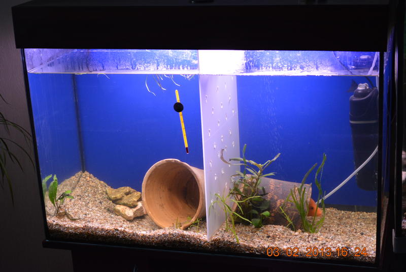 Пересадил из аквы с рыбасами в отдельный, т.к. при нересте забивали других рыб. Почти сразу как переехали, самец стал бить самку, я думал пройдет, свет им не включал. В итоге, поставил перегородку и т.к. самка сидела все время в горшке я сразу этого не увидел, а сегодня она чуть вылезла и я офигел, на ранах появился грибок или как это правильно, обтрепанные плавники с белыми краями и на теле как немного ватный налет, на местах ран.