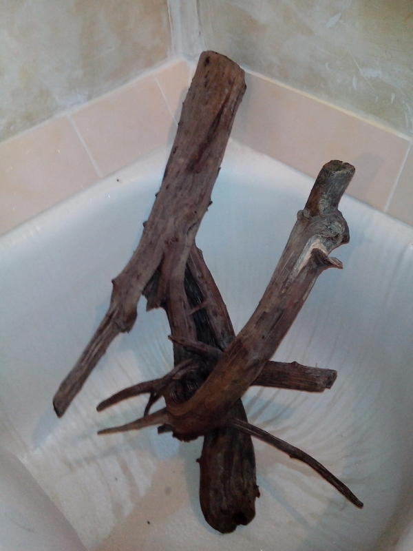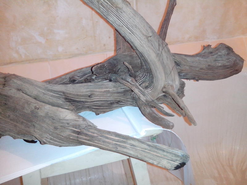 Привязана к камню дабы не всплывала. Два года была в аквариуме фото которого в профиле. Пол года уже лежит на балконе. размер: 70Х42Х45 порода дерева предположительно ива.