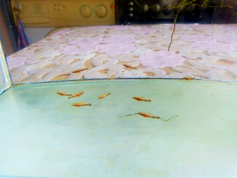 7 января отнерестилась пара нанностомусов мортенталера. Всего было 21 икринка,из которых через 3 дня выклюнулись 17 личинок. Все они еще через 4 дня поплыли и получили корм-инфузорию.Через месяц мальки подросли и,казалось что проблем уже не будет, стали часто дышать и отказались от корма. Я не стал экспериментировать с лечением и добавил в аквариум половинную дозу медного купороса. К счастью рыбки оказались стойкими к купоросу,но 5 мальков я все же потерял. Теперь рыбкам более 3 месяцев,живут в общем аквариуме и педают практически все виды корма,которые помещаются в ротик,хотя хорошими едоками назвать их не могу.Растут потихоньку..... На двух фотках производители.Прошу прощения за качество-не специалист.