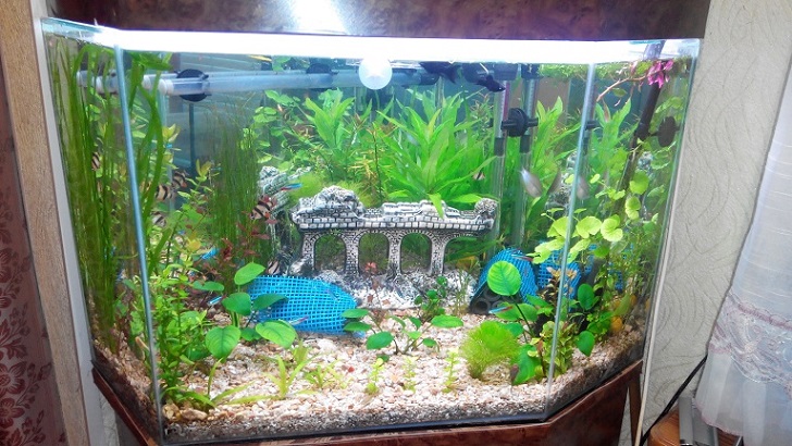 Население 2 молли, 2 гуппи, 2 жемчужных гурами, 1 самец мраморный гурами( второго пришлось отдать за отвратительное поведение и избиение всех жителей аквариума), 11 неонов, 2 петушка самка и самец, 2 данио розовых. 5 суматранских барбусов, 3 анциттруса и 2 коридораса + улитки