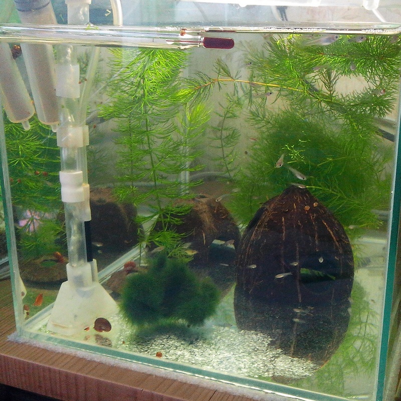 В отсаднике на 10 литров примерно 100 мальков гуппи 2 молодых коридораса и до 10 простых креветок.