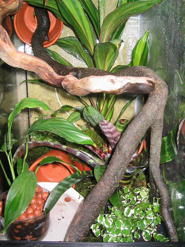 Кстати,попытка №3 переделать террариум  Дело в том что мне дико повезло, у нас на стадионе недалеко от дома, где мы обычно гуляем с собакой , поменяли газон....Кусок бесхозного газона валялся на выброс. У меня теперь огромный кусок искуственного газона в гараже  . Обалденный, плотный, высокий, очень мягкий, ну прям как натуральная трава. Вот, переделанный террариум. Кстати, поселила всех сново вместе. Сомневаюсь что ленивые литории будут охотится на сородичей  . Важный момент - растения раньше были в разных горшках, за ними постоянно прятались животные и насекомые. Теперь я нашла один длинный горшок(60Х16Х16), в который посадила все растения и поставила его плотно к задней стенке террариума. Задний фон пока поместила снаружи за стеклом. Он объемный и будут щели, которых я пытаюсь избежать. В будущем планирую купить фон из кокоса. Горшок на дне террариума, весь пол террариума засыпан мелким керамзитом(ну не совсем керамзит, для цветов шарики продаются для дренажа, не переведу уже - стала русский забывать  ), сверху газон, полоска газона на крае горшка. Просто сверху поставила корытце с водой, в него горшочек с лианкой. Расставила коряжки. Передняя стенка водоема закомуфлирована естественным образом травкой, боковая горшками с растениями....Ну вот, уборка быстрая - достал ветки, кювет с водой, сполоснул газон, все на место и готово. Нужно обязательно время от времени промывать дренаж. От частого опрыскивания собирается много воды и все это со временем будет неприятно пахнуть и распространять всякую гадость  . Ну вот такой террариум получился, и живые растения и натуральные коряжки, и удобное для уборки решение с искуственным газоном  ....Правда, не факт, что со временем мне еще чего в голову не взбредет и что опять не переделаю  . Кстати, первоначально хотела клеить бассейн из стекла, делать перегородку для фильтра и соорудить в правом заднем углу водопадик. Пока нет времени  .