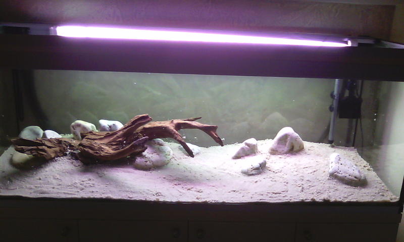 Уложил слой крупного песка белого, камни и вот такую композицию из нескольких мангровых коряг.