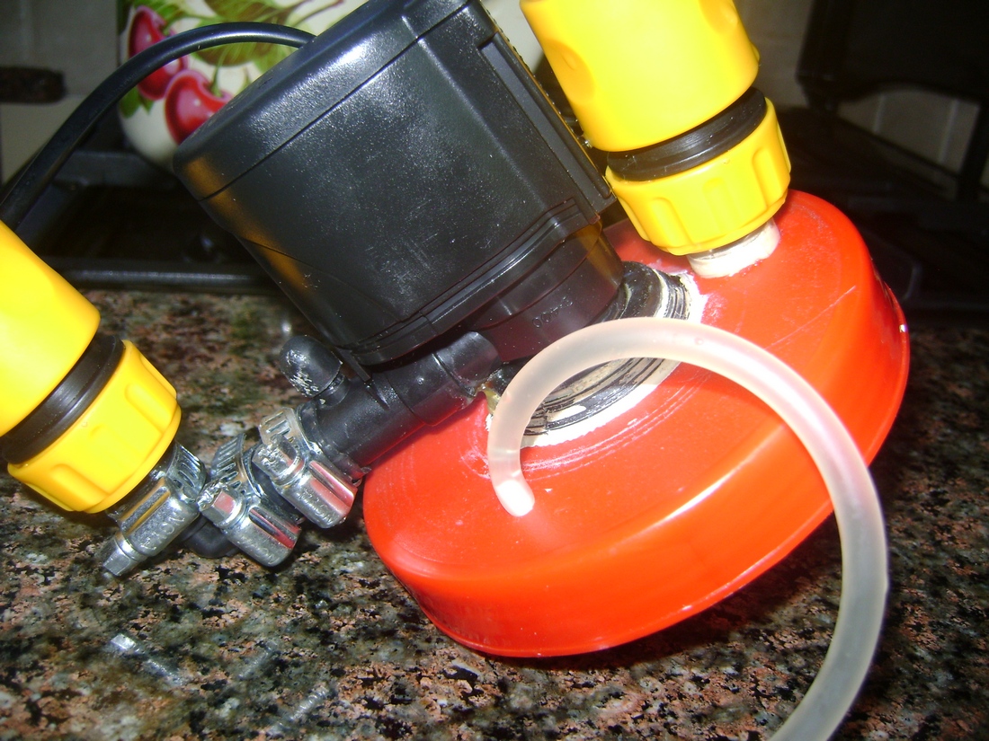 На помпу приколхозил выпускной шланг с быстроразъемом, на заборное отверстие- впускной шланг с быстроразъемом. Сделал еще один тонкий шланг с крантиком для развоздушки.