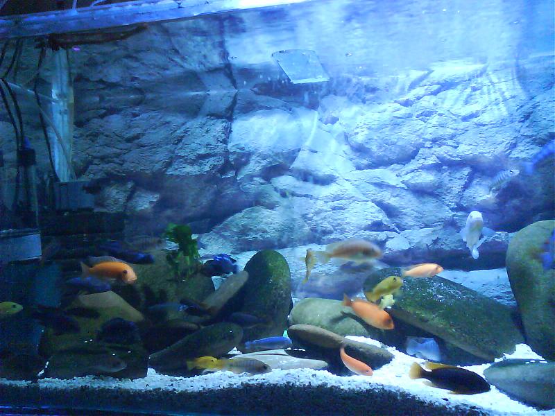 Вообщем 350(135*50*50)литровый аквариум , рыбы восновном представители Мбуны, зебры 2вида, Псевдотрофеусы Пиндани, белый принц, Демасони, Солуози, Меланохромисы Йохани, золотой Йохани, Чипока, Ауратус, Йодики, из Утаки Джексоны, васельки, еще всякого разного, всего штук 45