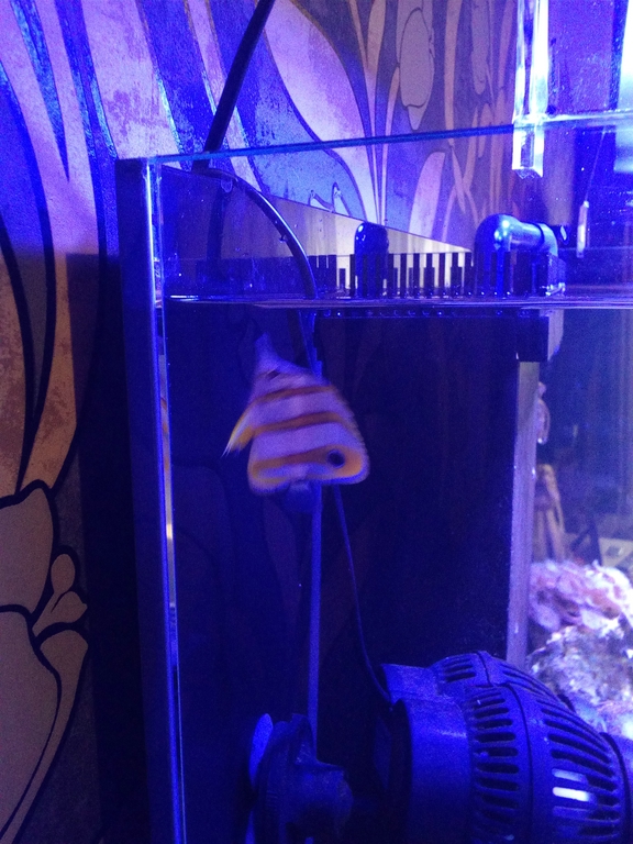 Сделал кормушку, положил туда артемии, плавает в сантиметре от кормушки, не берет. На фото видно его поведение, у поверхности воды прыгает и по стеклу плавает, ничем не интересуется