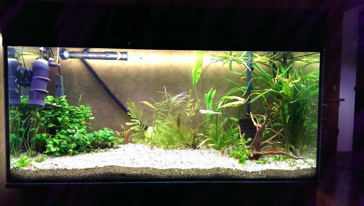 Жена пошла делать фото аквариума, а я нашел фотографию при запуске... Но на ней видно, что света мало и где расположен внутренний фильтр, через который и подается кислород )