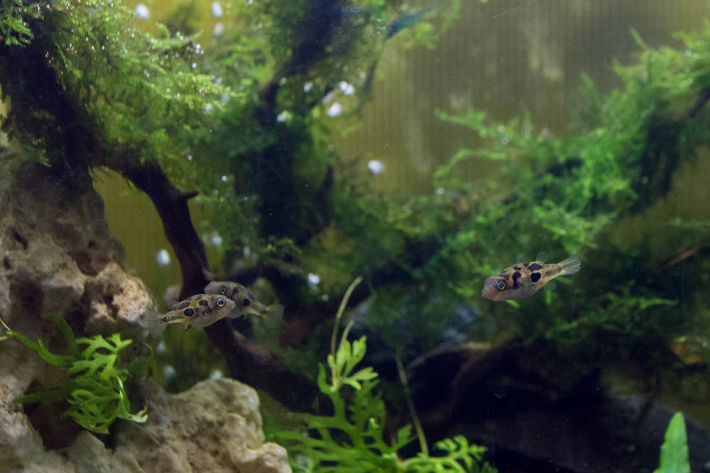 Обустроила маленький дом для пятерых карликовых тетрадонов. Здесь же живут пятеро синих креветок и пара карликовых раков Апельсин и Мандарин. Под требования обитателей - камень с кучей дыр, две пещеры, три грота, ну и дерево со мхом, на котором тетрадоны изображают яблоки.