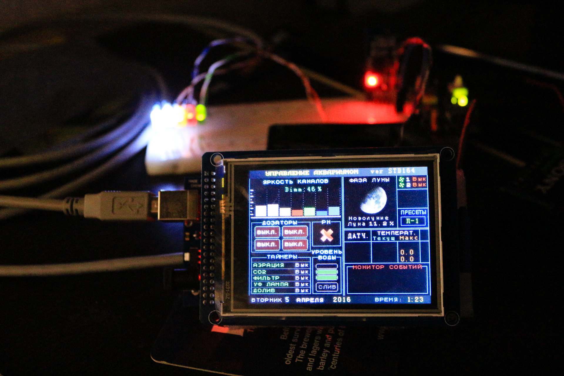 Sem, софт действительно с темы "аквашилд Олега" на рифцентрале. Сборка STD164. До нее перепробовал много других, но эта больше всего понравилась (хотя функционал и немного избыточен). По поводу луны - фишка очень на многих сборках стандартная, зачем она я толком не разбирался (для меня просто красиво) но вроде от фазы луны будет зависеть яркость ночной подсветки (если выводить с отдельного пина линию на "светодиод/луну").