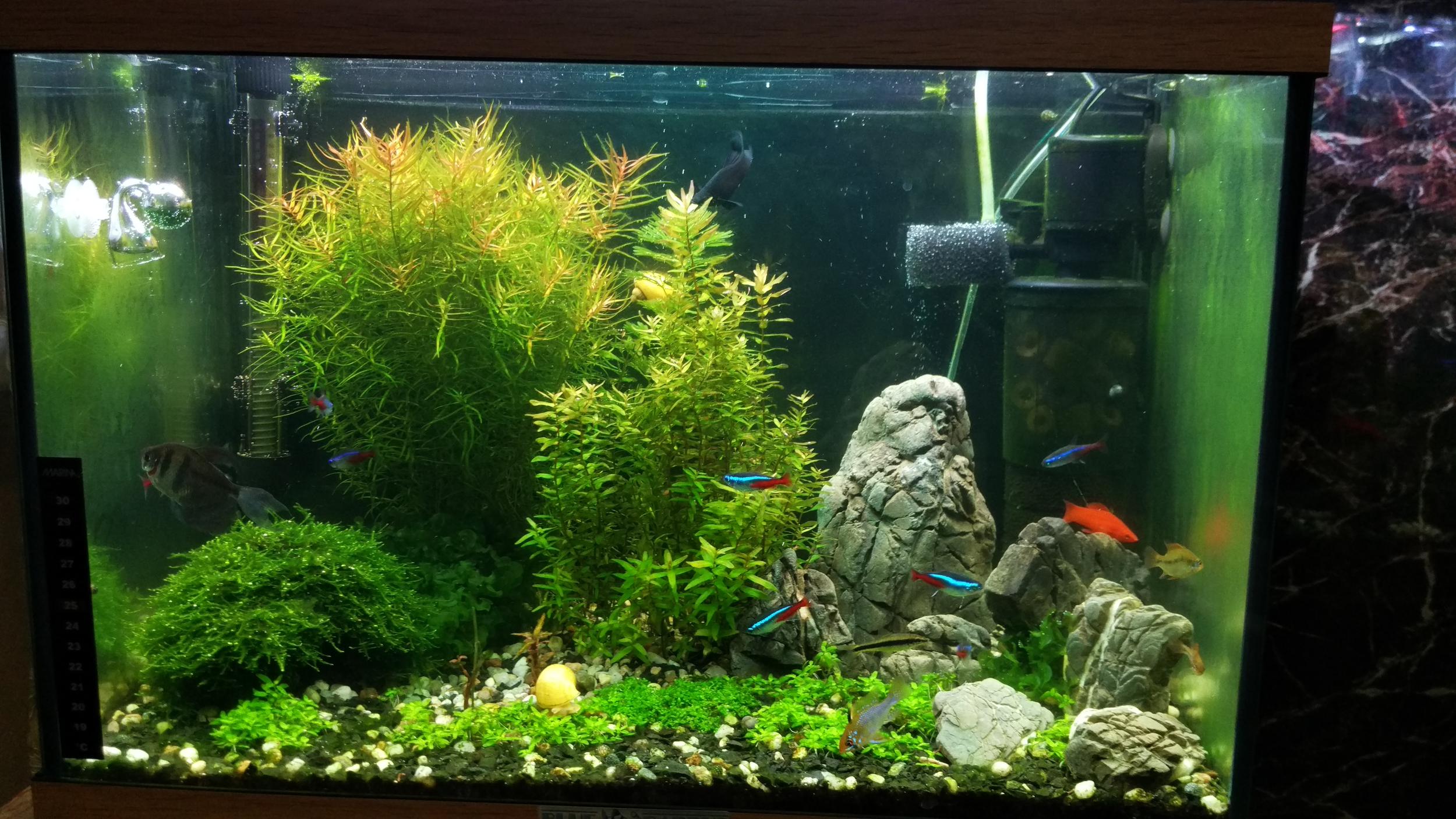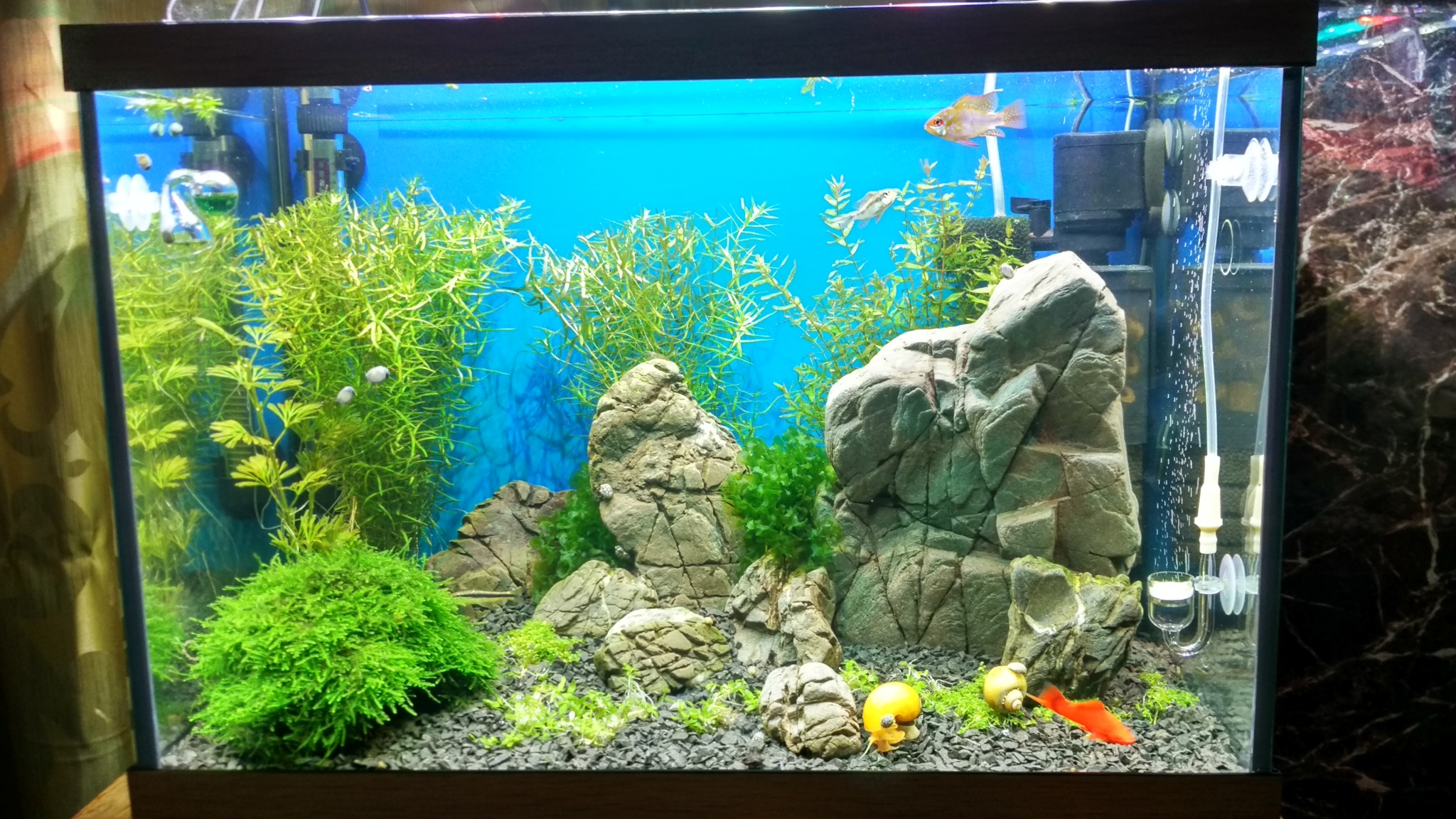 Итак, прошло три недели, и в аквариуме кое-что изменилось, убраны некоторые растения, отданы друзьям кое-какие рыбы, появилась подача со2, добавлены камни
