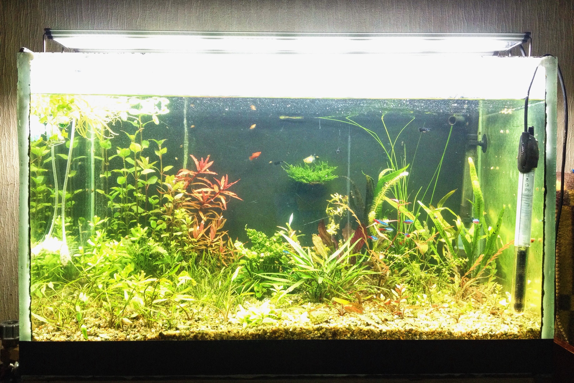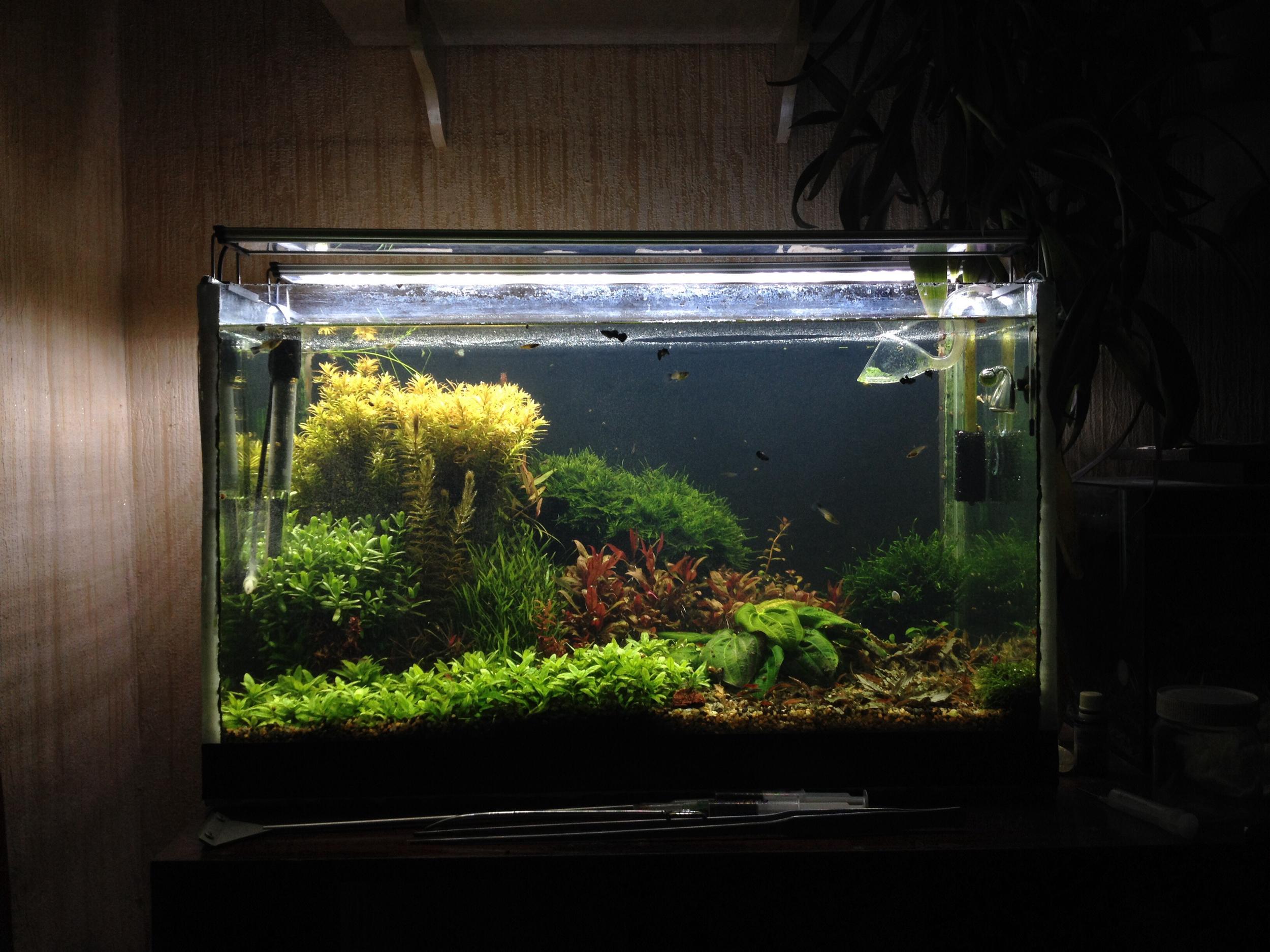 Перед установкой нового освещения для чистоты эксперимента был произведен рестарт банки с частичной сифонкой дна и полной пересадкой растений с заменой 50% видового состава .Присутствуют как простые (скоростные) стебли так и очень светолюбивые капризные виды,видовой состав будет оглашен немного позже после полного утверждения .