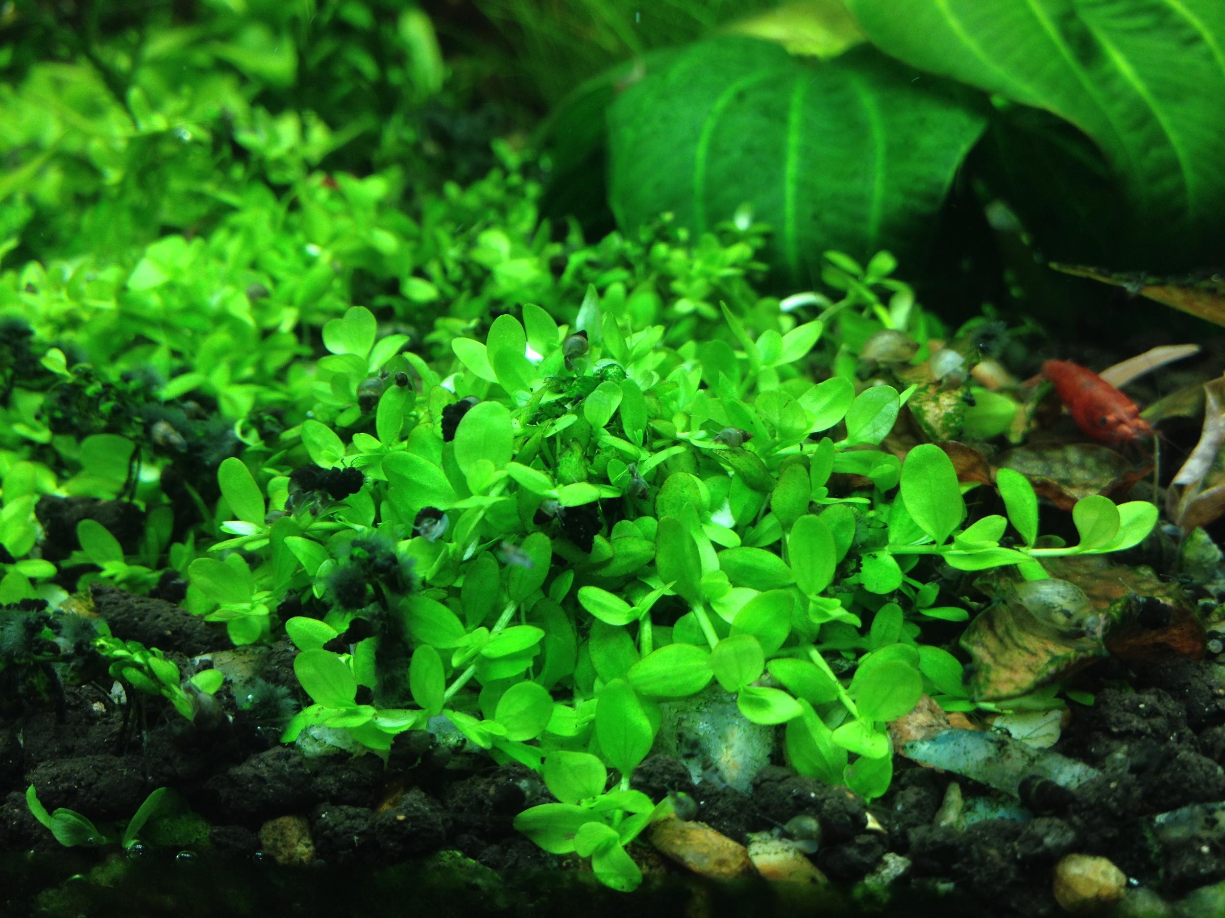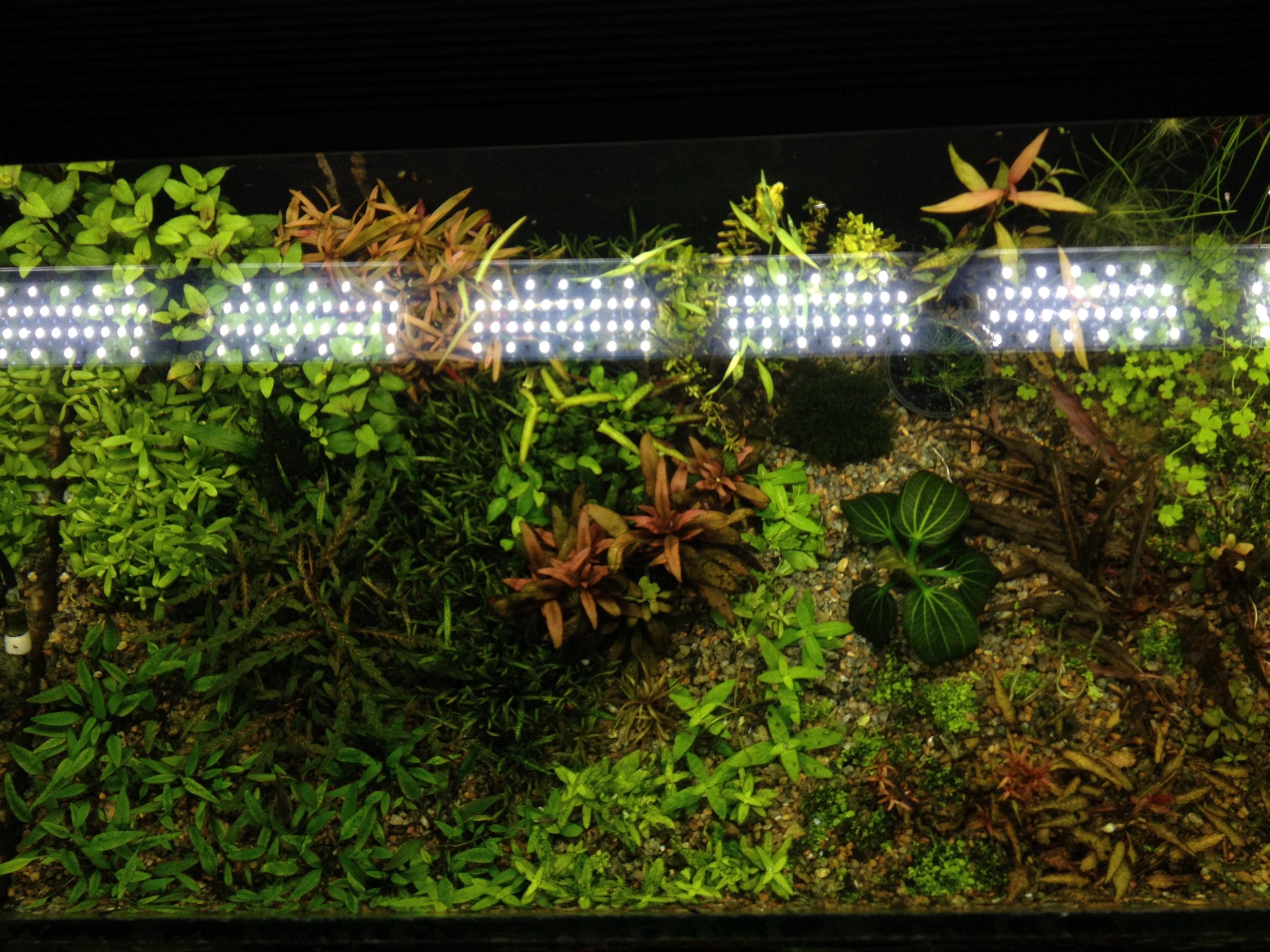Много новостей накопилось с момента старта под новыми светильниками.Что я могу сказать ,это реально то что нужно для травника ,именно можно творить что хочешь.Светят они очень ярко .Сразу как поставил было 6ч 2 недели потом перевел на 8 .Единственное что было трудно это внесение макро ,железо и микро (аквасис) ежедневно по 2.Компенсировал внесение жидких удо земляной подложкой ,замачил литр повымывал с недельку ,потом через дуршлак и в банку ,померял тест ,фосфат зашкалил ,нитрат 30-40,вода коричневая как чай ,неделю подмена ежедневно по 50 %,вроде все хорошо по виду ,краску почти вымыл.Растения пузырять стали очень сильно и самое главное перестали стекла зеленеть ,зеленка задолбала ,по началу воопще таких креньделей давала ...вечером почистил стекла утром уже налетик заметен.Потихоньку наращиваю шапки.