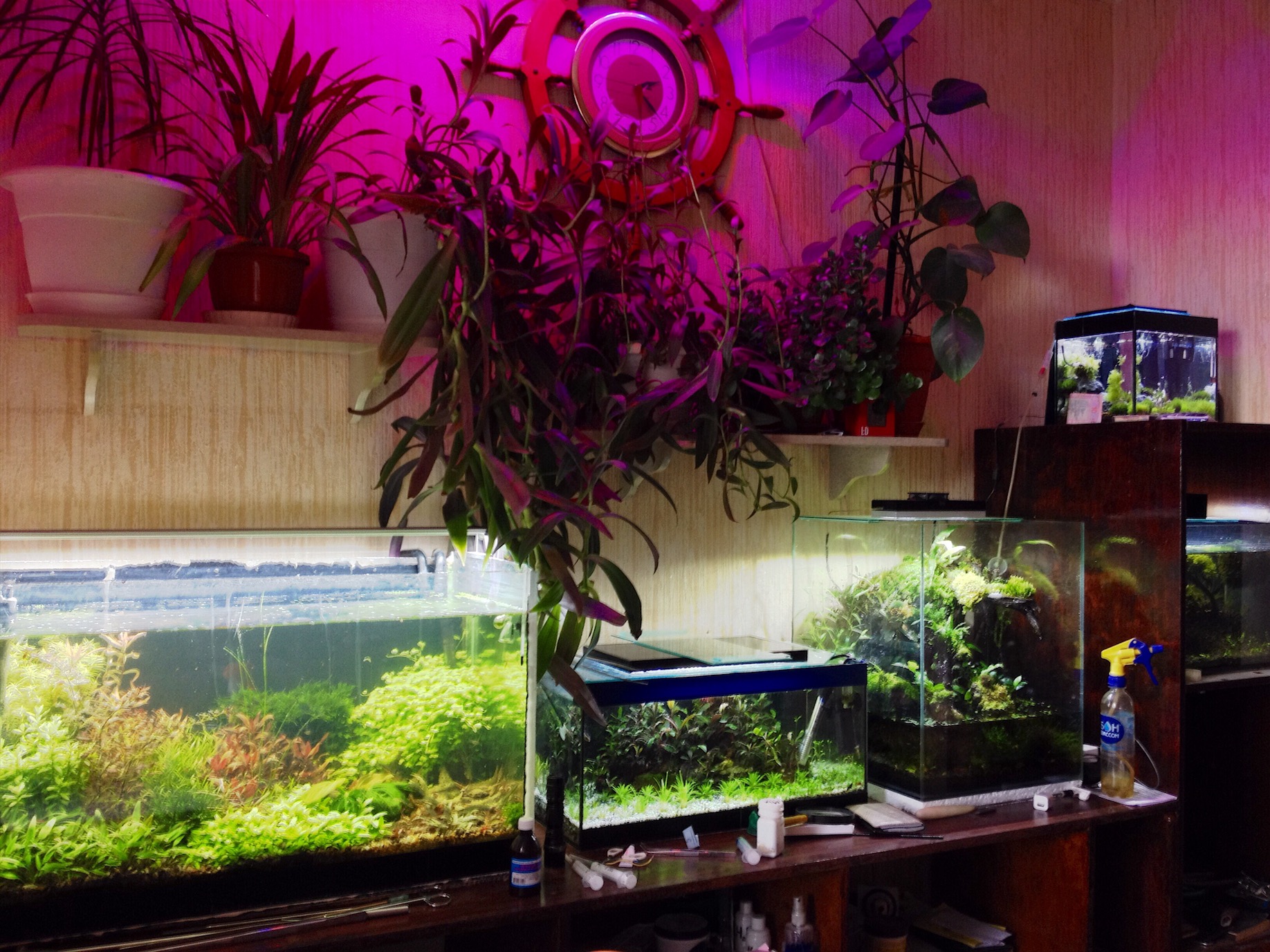 В общем ,свет -яд без комментариев .По аквариуму .Банка переехала на кухню ,теперь все аквариумы в одной куче ,очень удобно теперь и наблюдать и ухаживать ,короче класс .Аквариум перетерпел полную перепланировку ,некоторые растения убрал ,некоторые добавил ,перешел на ступенчатый метод освещения поставил лилипайп и все сразу стало на свои места ,удобрений даю мало в основном только микро -железо.Светильник светит один 10ч в середине дня включается второй на 4ч оба на отдельном таймере .Водоросли присутствуют в малом количестве в основном эдогониум ,но уже затихают ,подмены стандартные 30-40%.За все это время проблем с светом не возникло ,светильники просто "мечта".Далее хронология развития в картинках .