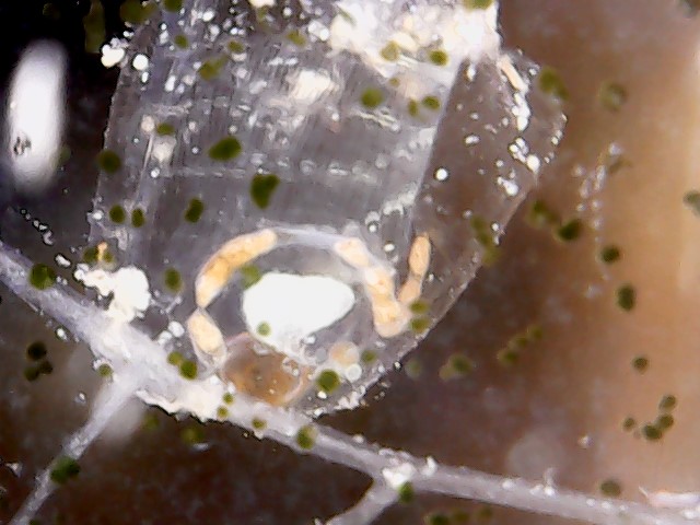 Выглядит как паутинка с коконами, внутри коконов какие-то личинки