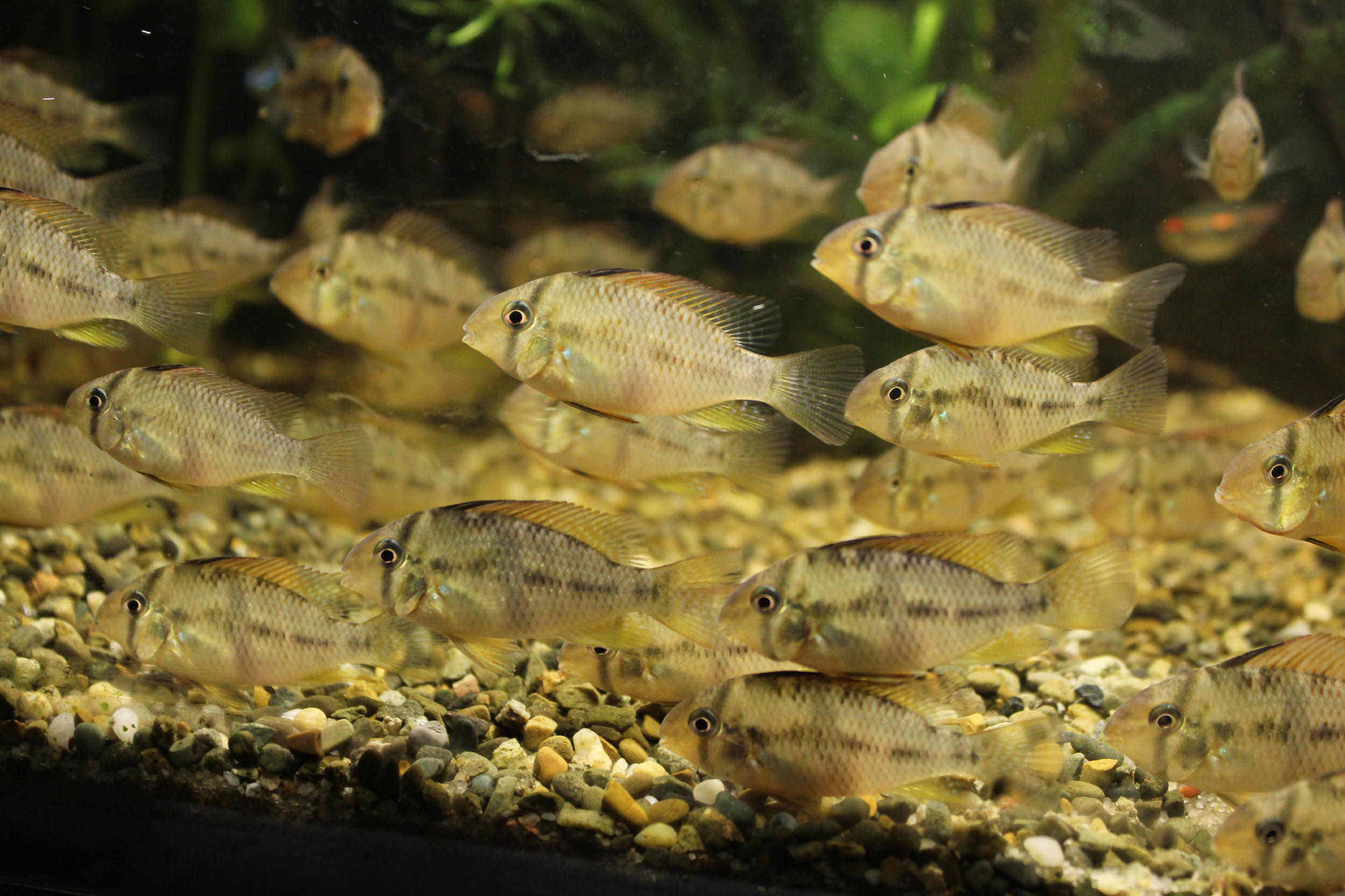 Guianacara owroewefi "Grand Laussat" ореал Южная Америка, бассейны рек Мараньон, Суринам, Сарамакка, Коппенаме. 10-12 см, самка меньше. По центру тела проходт вертикальная черная полоса. рН 6-7,5; dH 5-8; Т 22-25°С