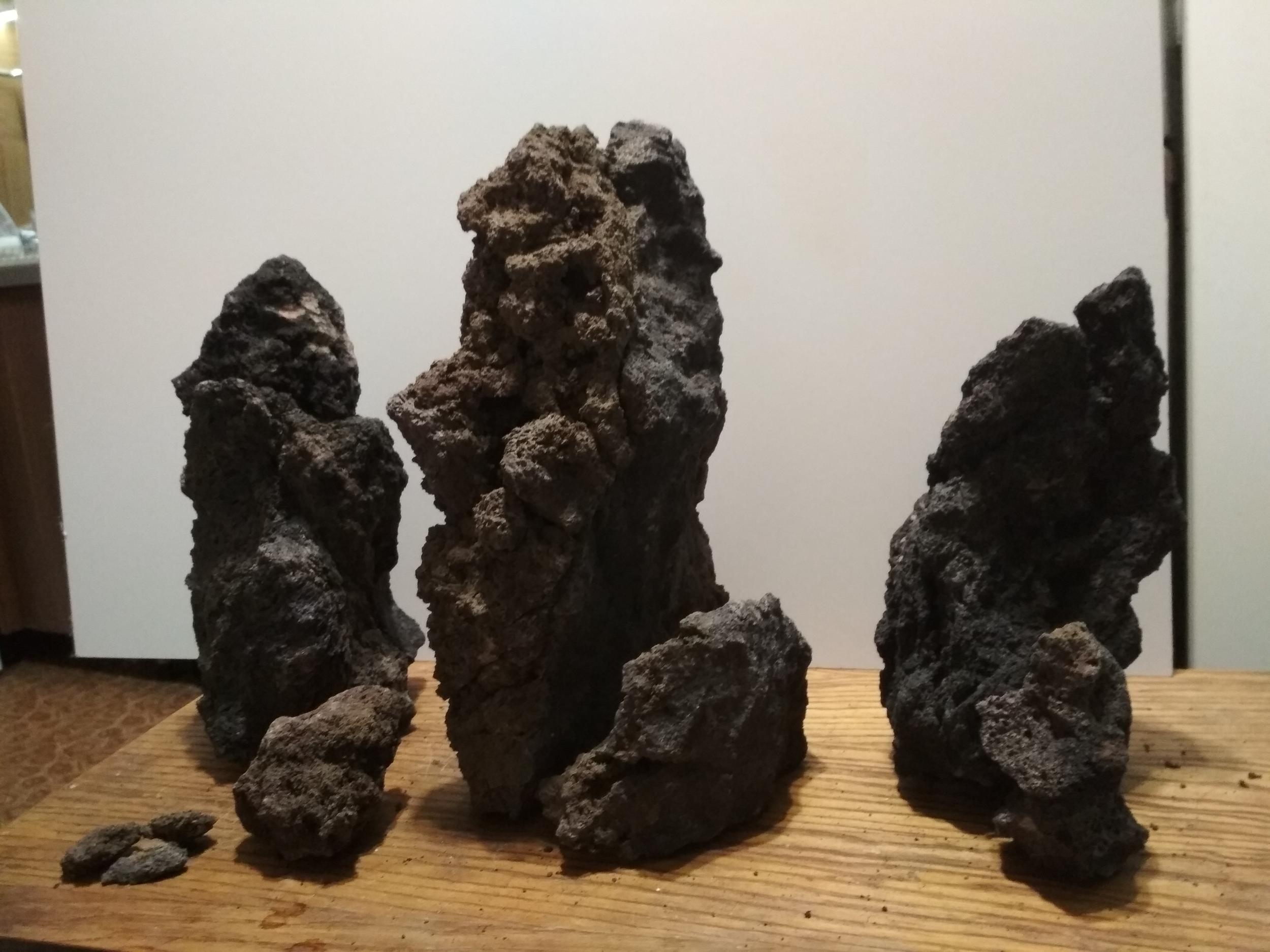 Камни. Выбрал три, как мне показалось, подходящих. Когда приехали просто офигел. Получилось около 20 кг. Ещё и никак нехотели стоять. Взял молоток и пошел лупашить... В итоге получилось вот это: